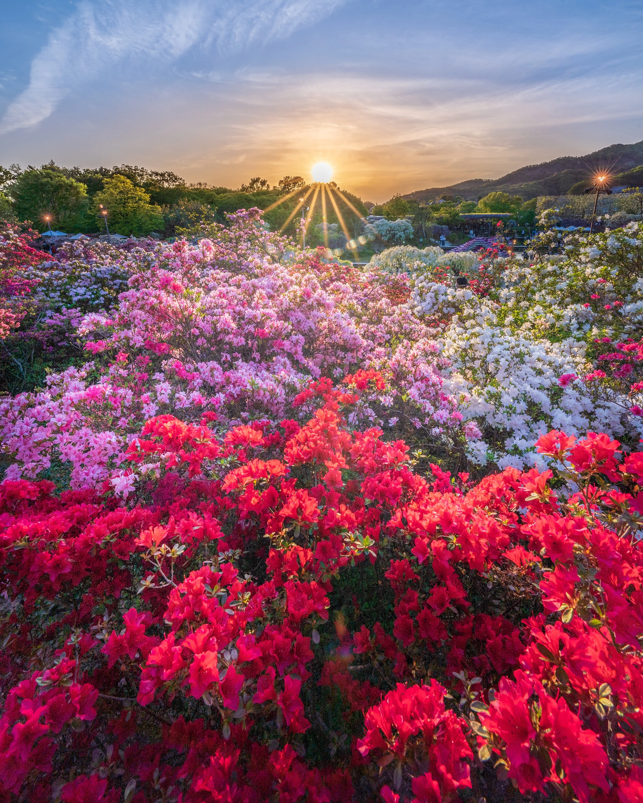 園内には350本以上の藤の花と、5,000株を超えるツツジが咲き誇り、