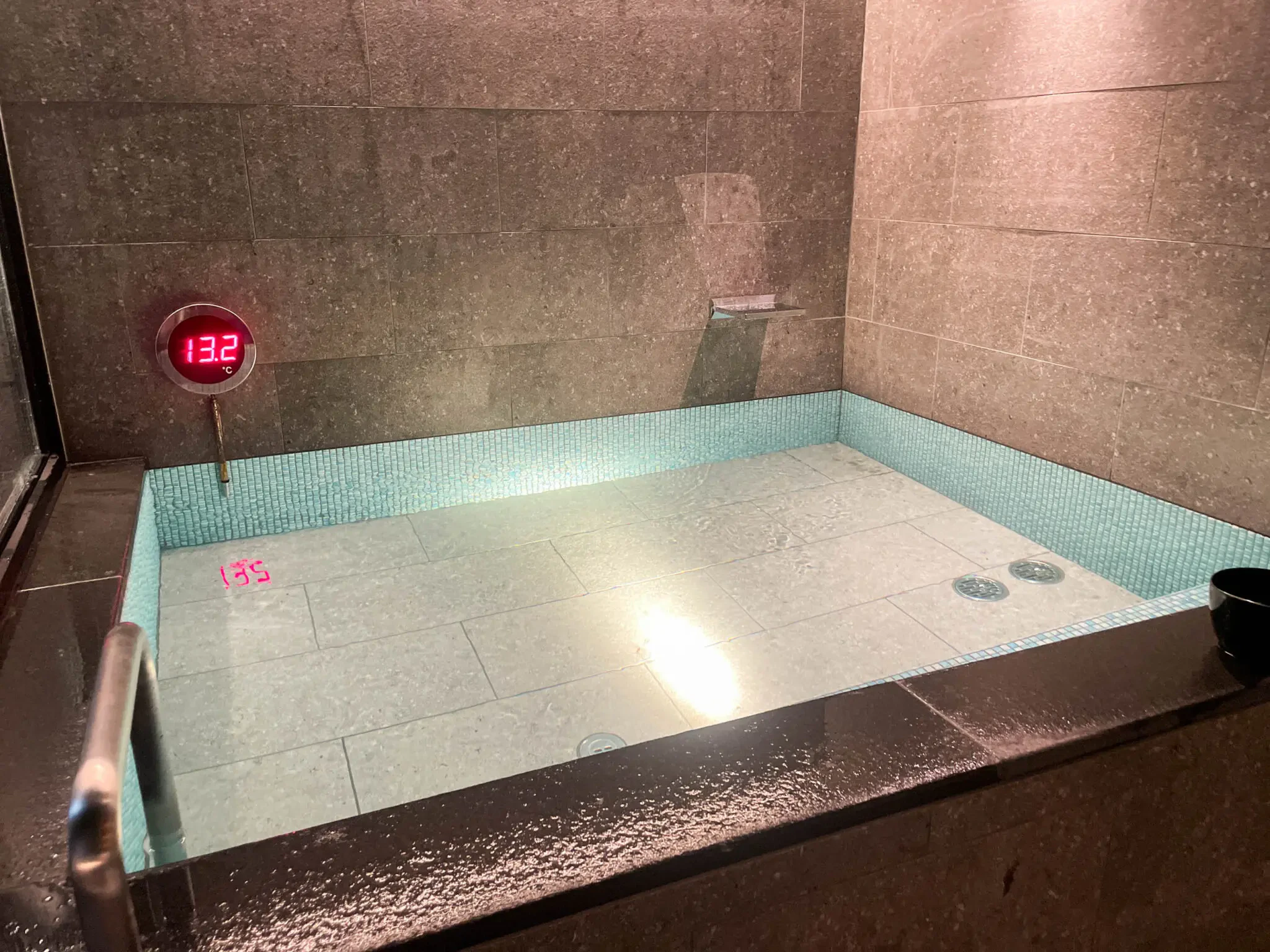 ブルーのタイルと煌めく光の演出が美しい水風呂は、キンキンの15度設定。