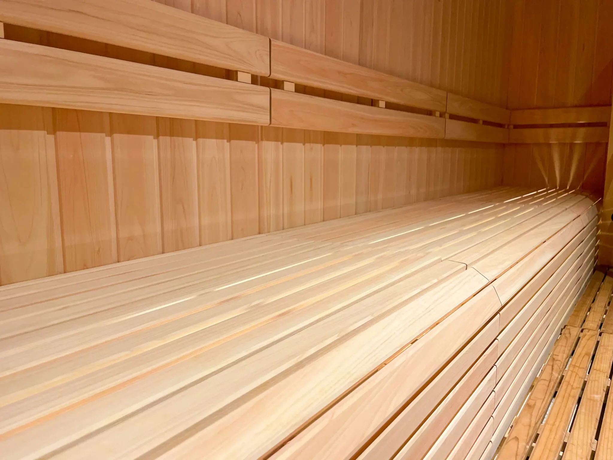 注目のサウナは、全面ヒノキのあたたかみを感じる雰囲気。どこも見てもピカピカで、出来立てホヤホヤの香り。