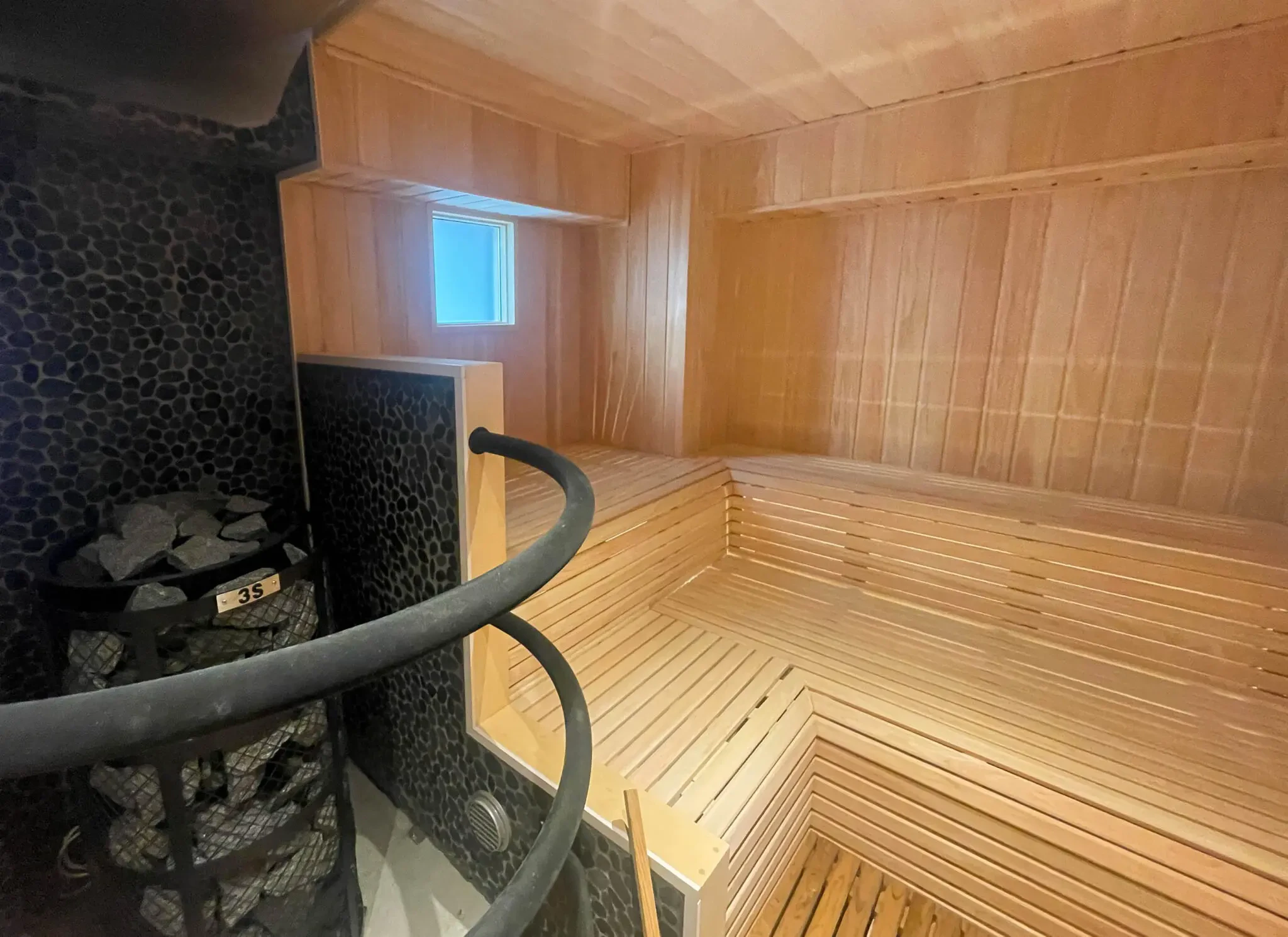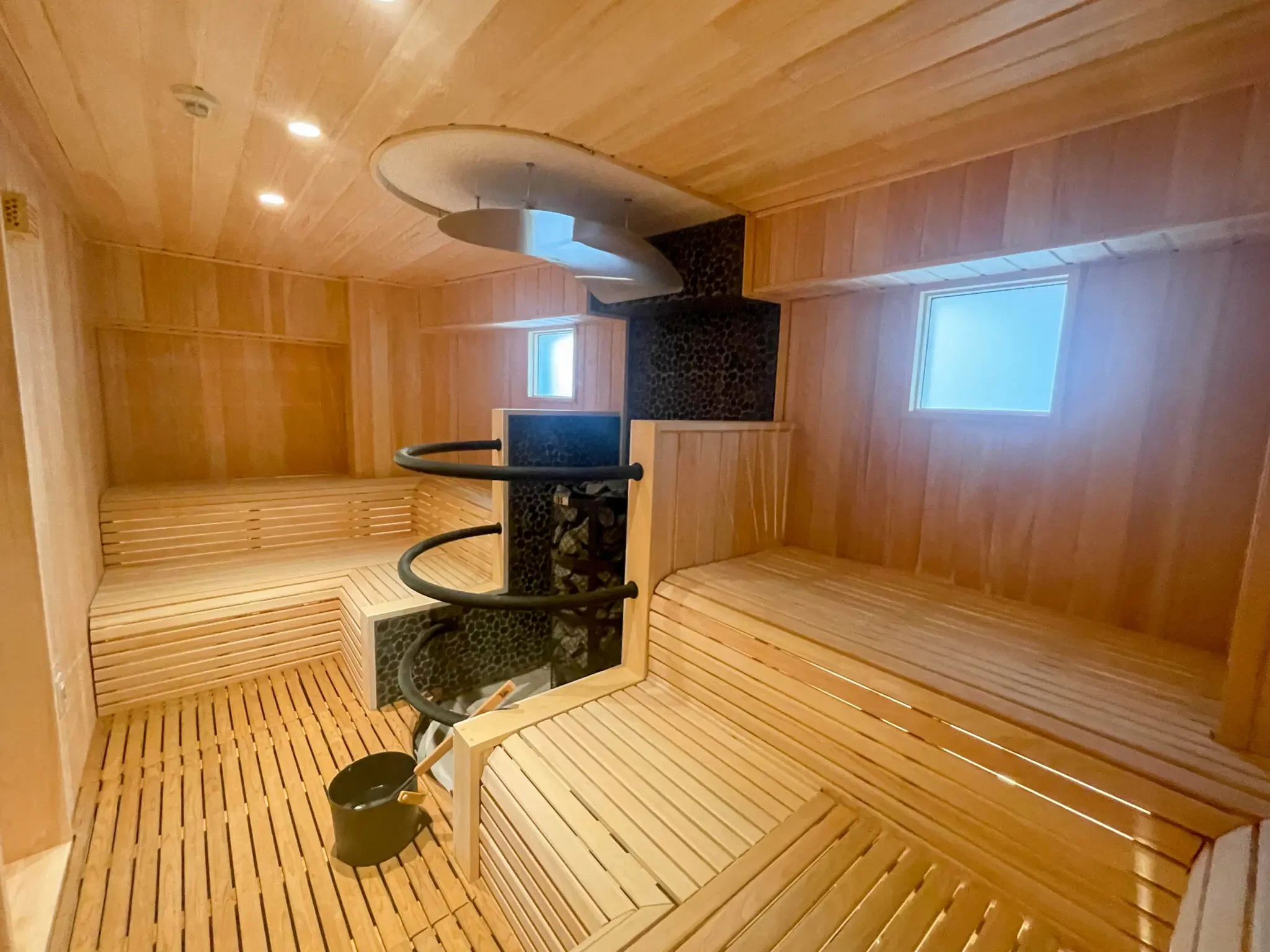 室温は90度ほど。中央に鎮座するサウナストーブは、国産サウナストーブメーカーによる特注品。夜になると、ストーブの熱源が赤く色づくように設計されており、暖炉に火が灯されたような幻想的な雰囲気を味わうことができます。