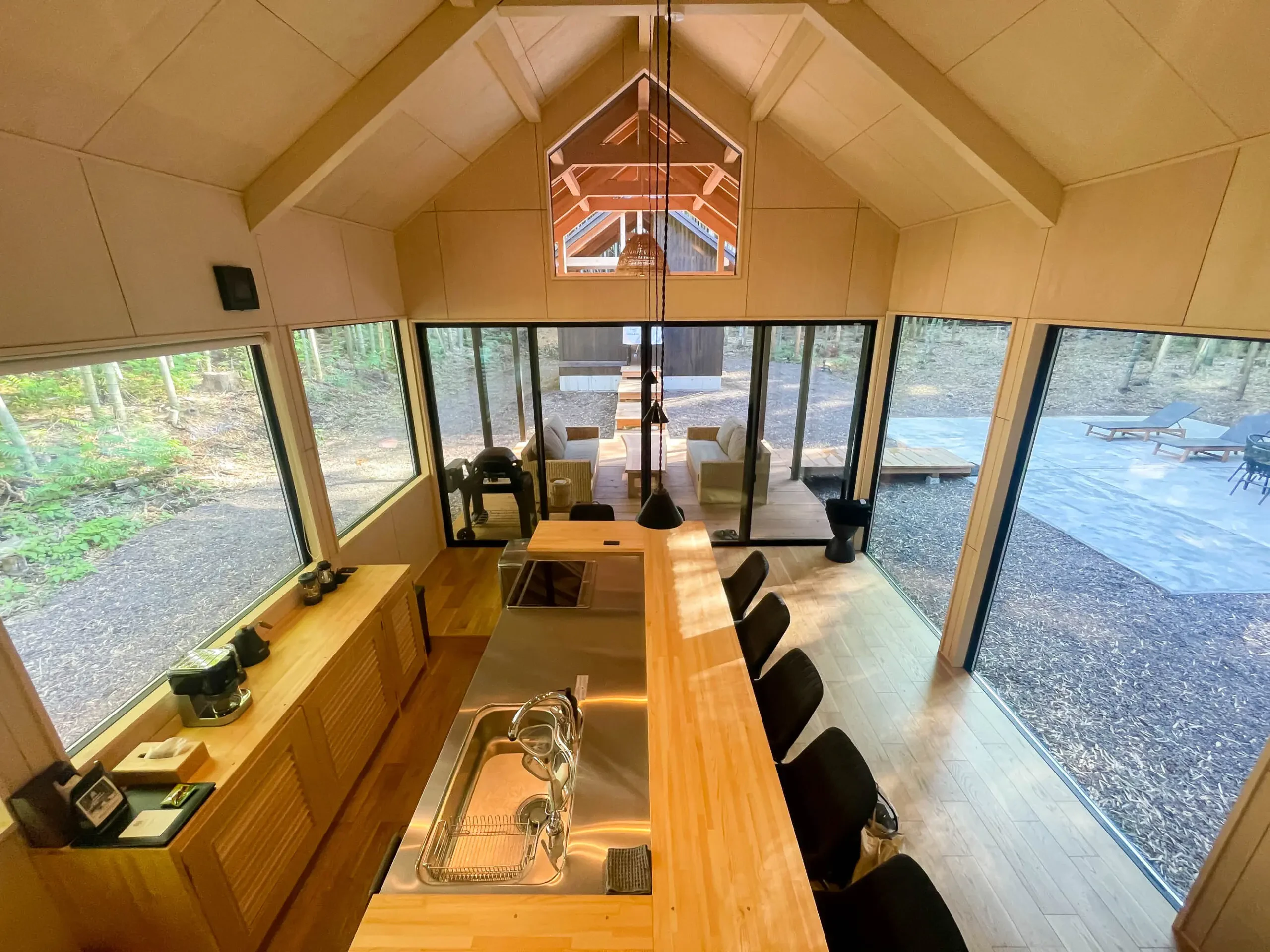 広くて開放的なキッチンスペースに、テラス席、ベッドチェア、秘密基地のような天井ベッドスペースまで。