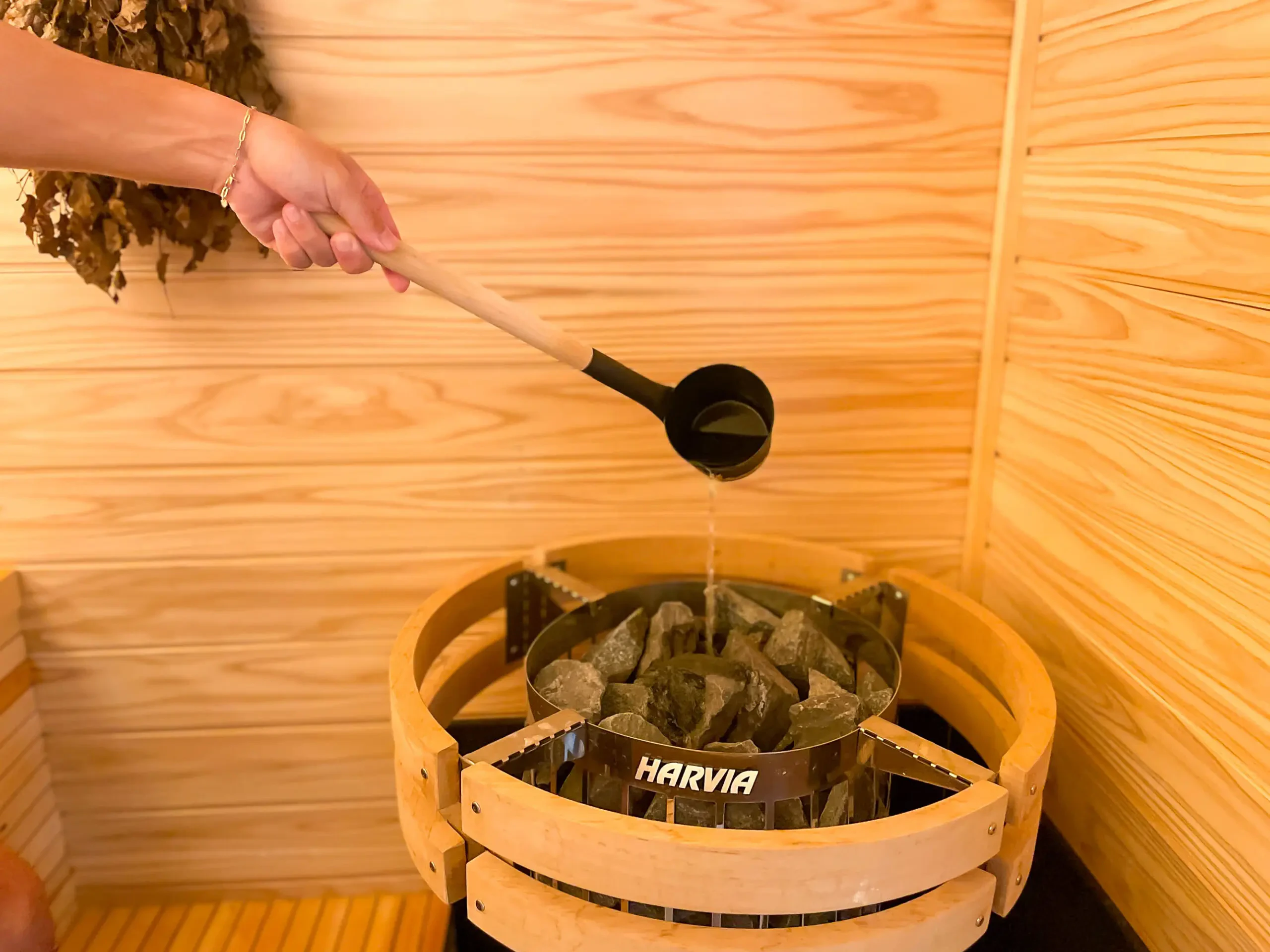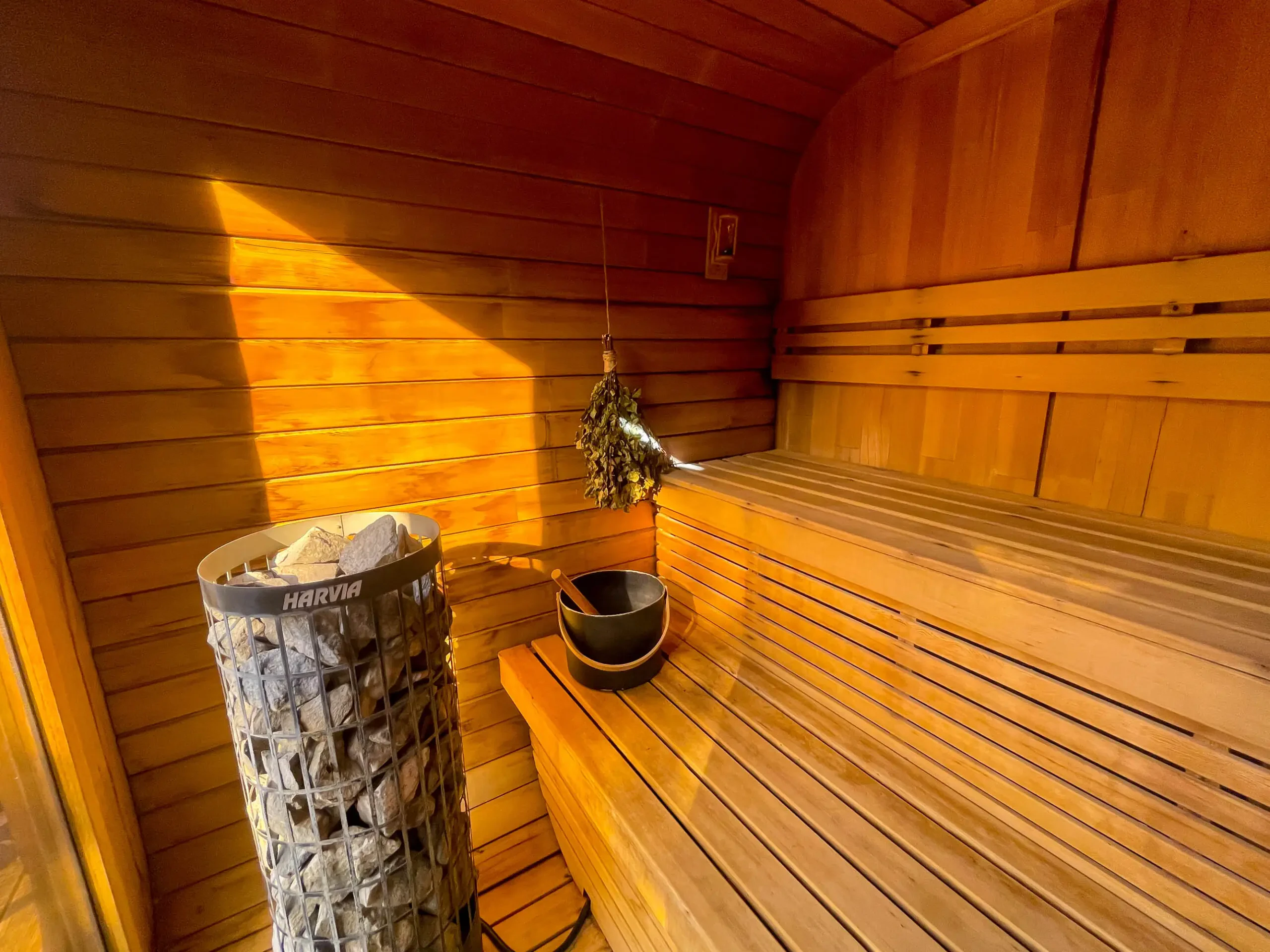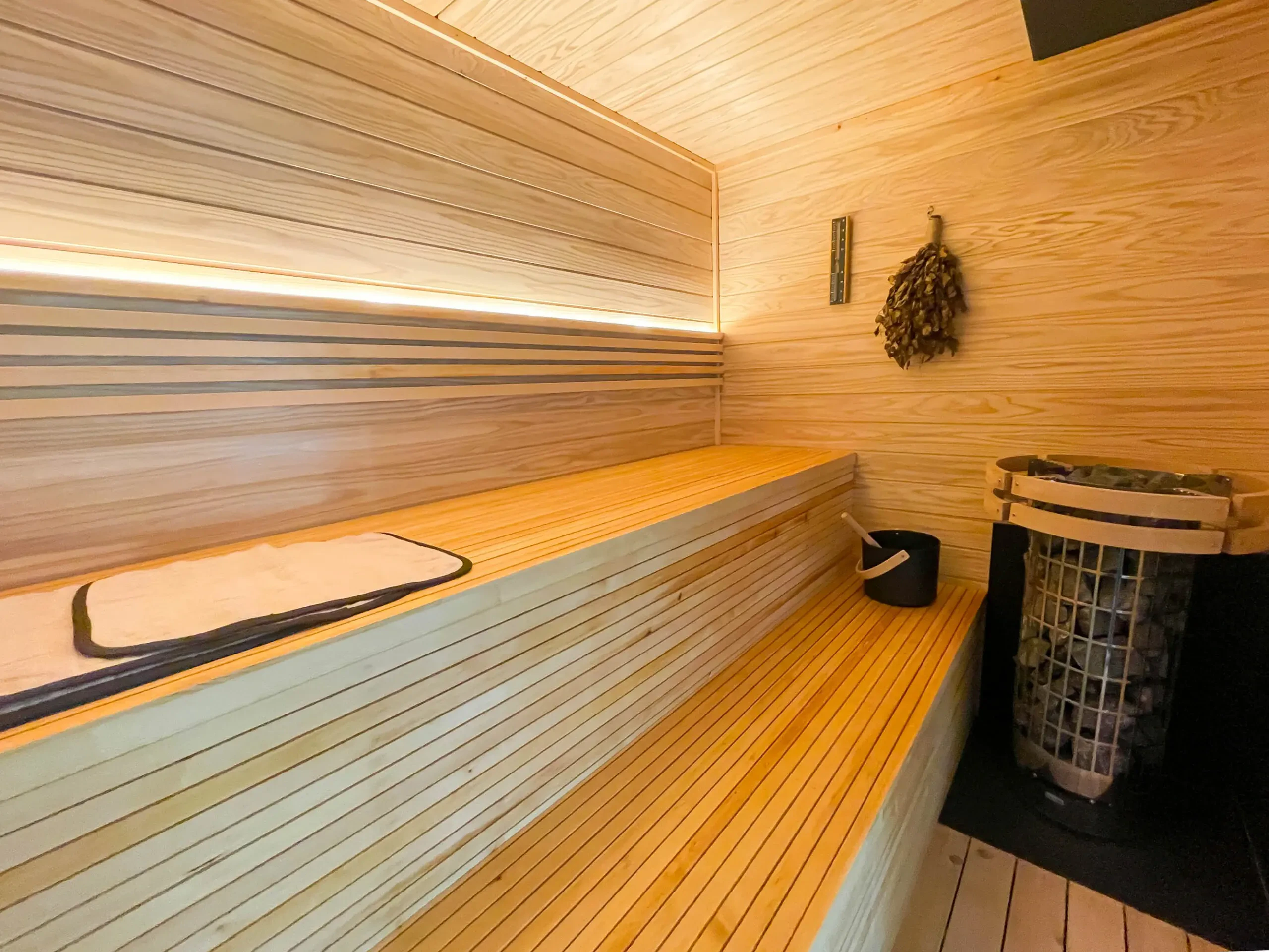 お好みでセルフロウリュも。座る位置がサウナストーブよりも上に設置されているので、ロウリュしやすいのも魅力的です。
