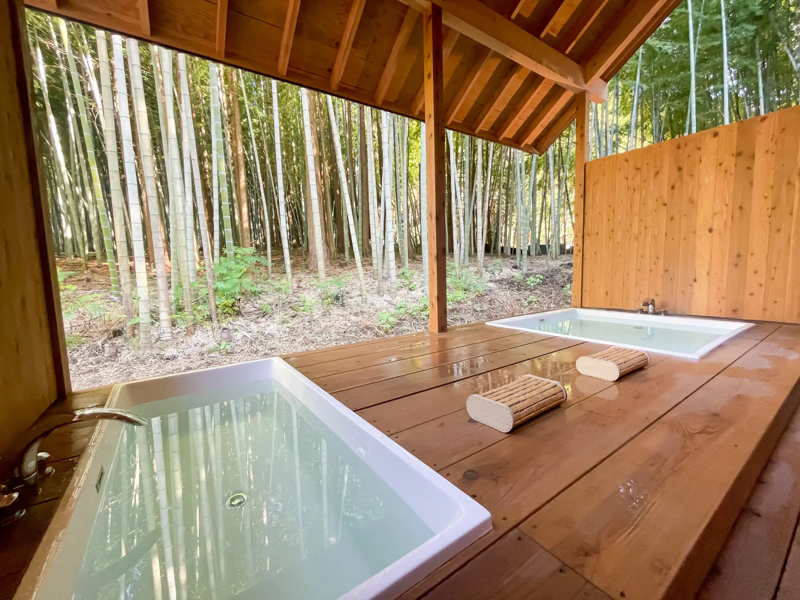 竹林に囲まれながら水風呂&外気浴!露天風呂もうれしい