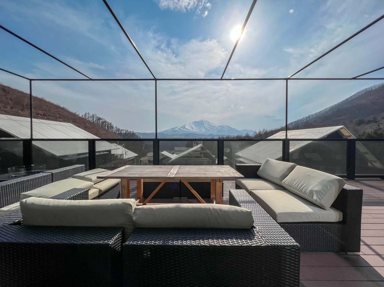 木の温もりを感じるデッキスペースでは、浅間山の雄大な景色を眺め、風を感じながらリラックスすることができます。