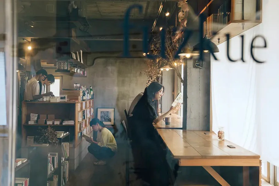 fuzkueは、初台駅から徒歩20秒という好立地に佇むブックカフェ。都会的なコンクリートと華やかなドライフラワーのコントラストが美しく、穏やかな店内で静かに読書に没入できます。