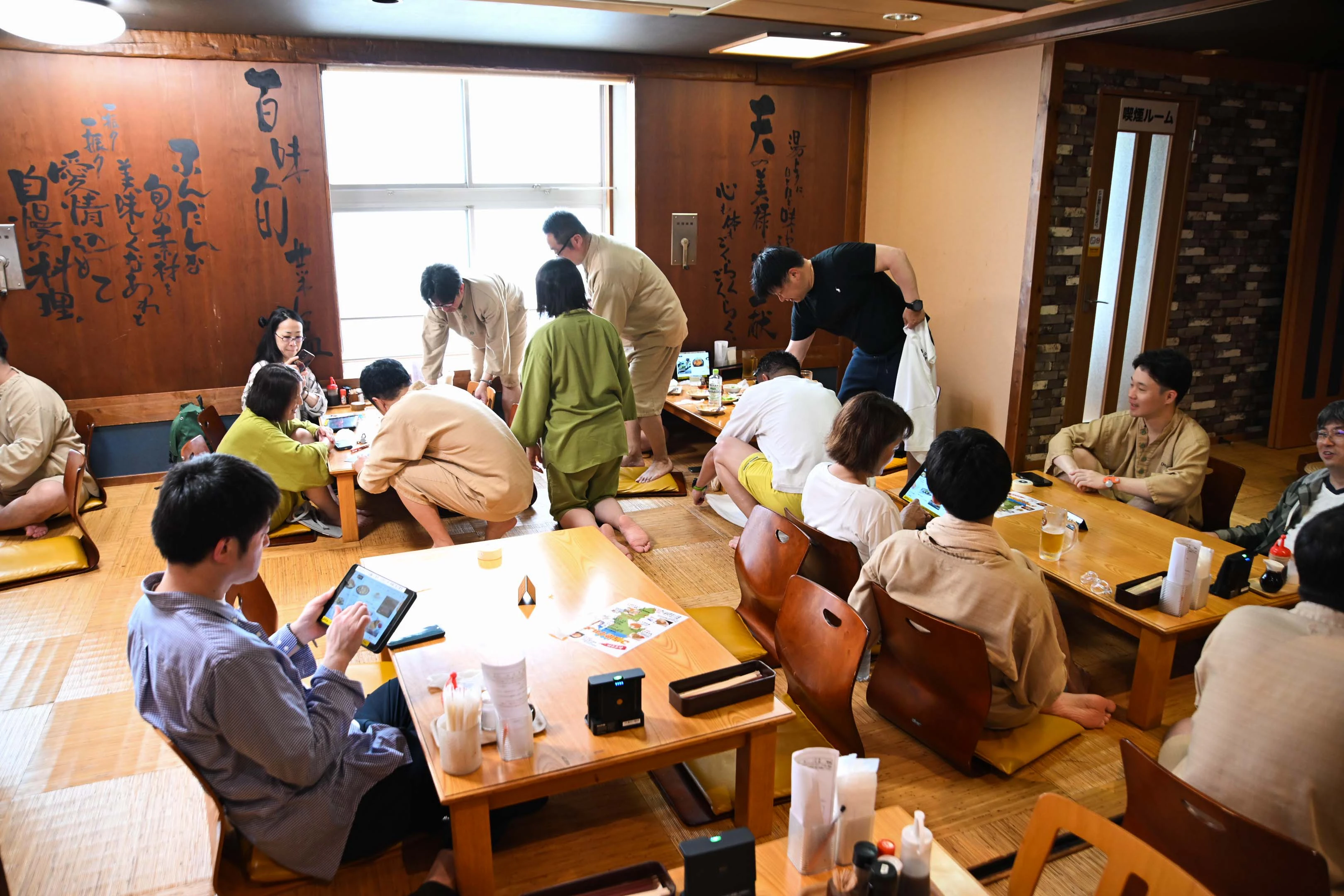 皆で館内着のまま、気取らず食事とお酒を楽しめるこの空間がまたいいんですよね。