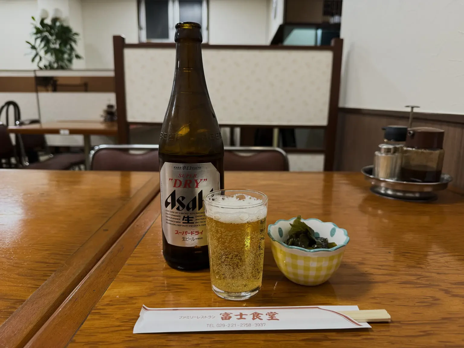 さて、無事ととのったところで、だんだんお腹も減ってきました。夜ごはんの店を探しに水戸の街へ繰り出します。すると見つけたのは、渋い見た目の「富士食堂」。この雰囲気がチルいんですよね。
