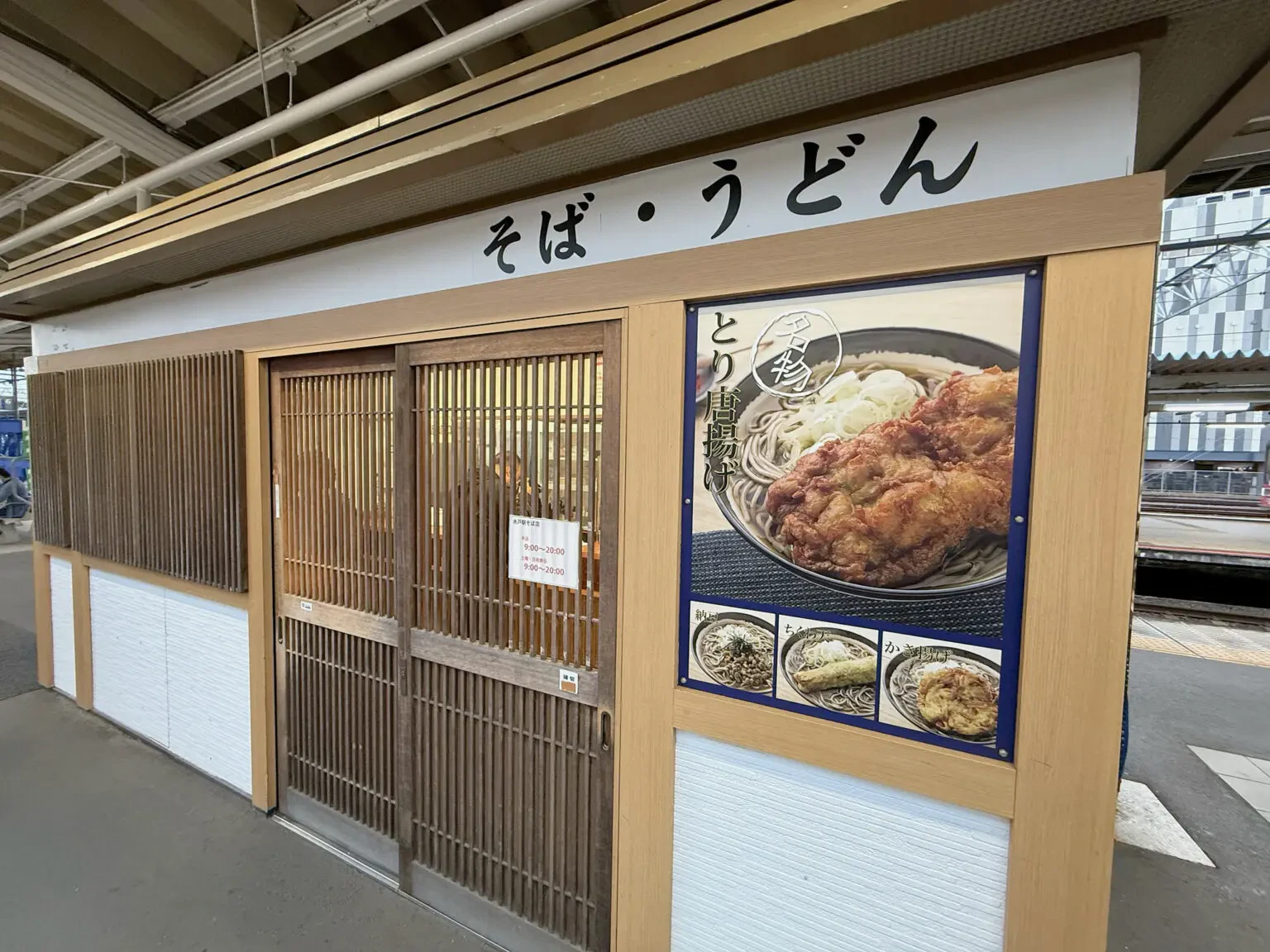 水戸には昼過ぎに到着。腹が減っては戦ができぬ、ということで、まずは遅めのランチを。JR水戸駅の5・6番線ホームにある「そばうどん水戸」に向かいます。