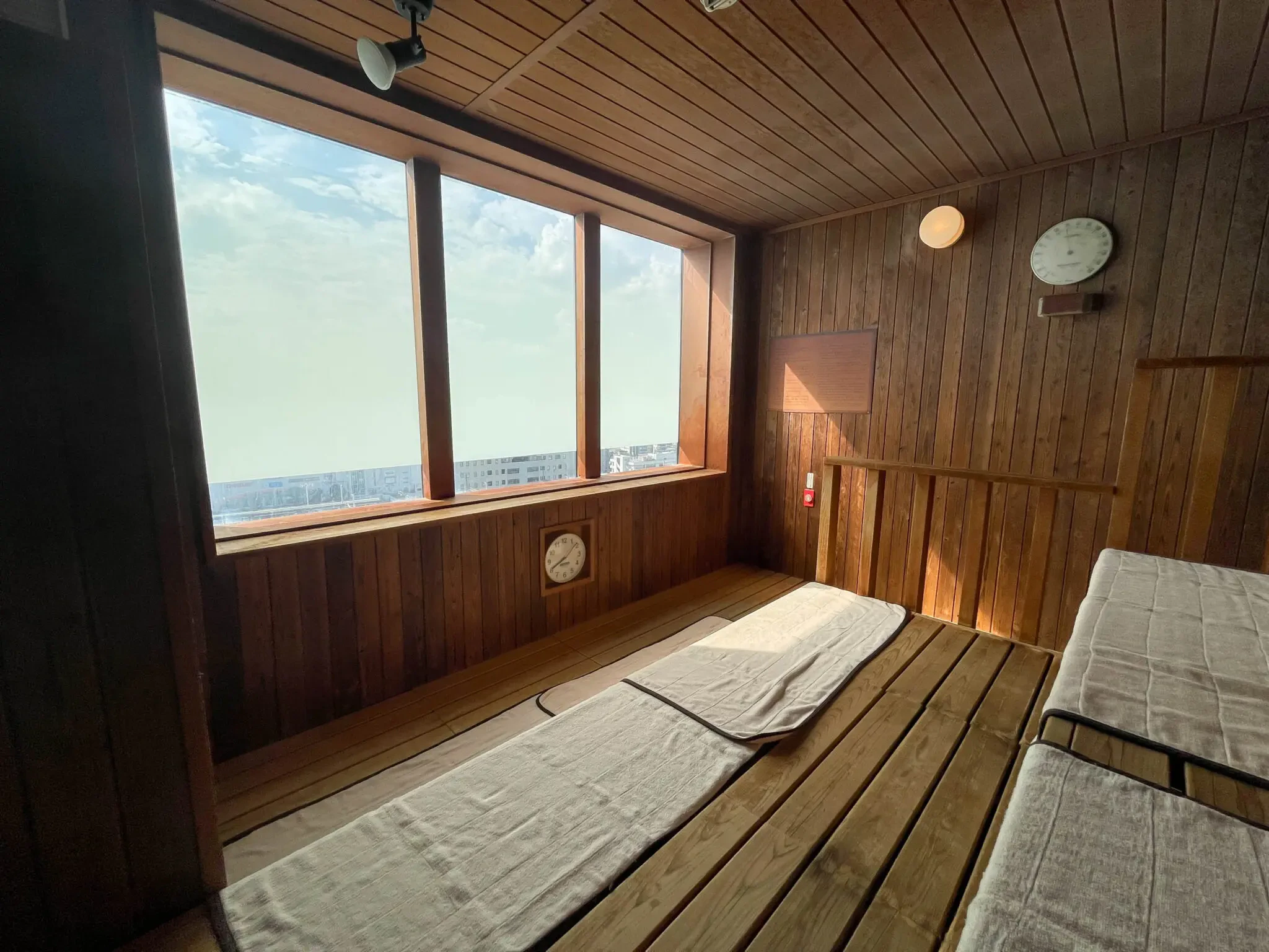 チルをテーマにするこの旅のラストにこのホテルを選んだのは、地上56mに位置する「スカイスパ」を満喫するため。広々とした内湯でさっと身体を温めたら、サウナへ!