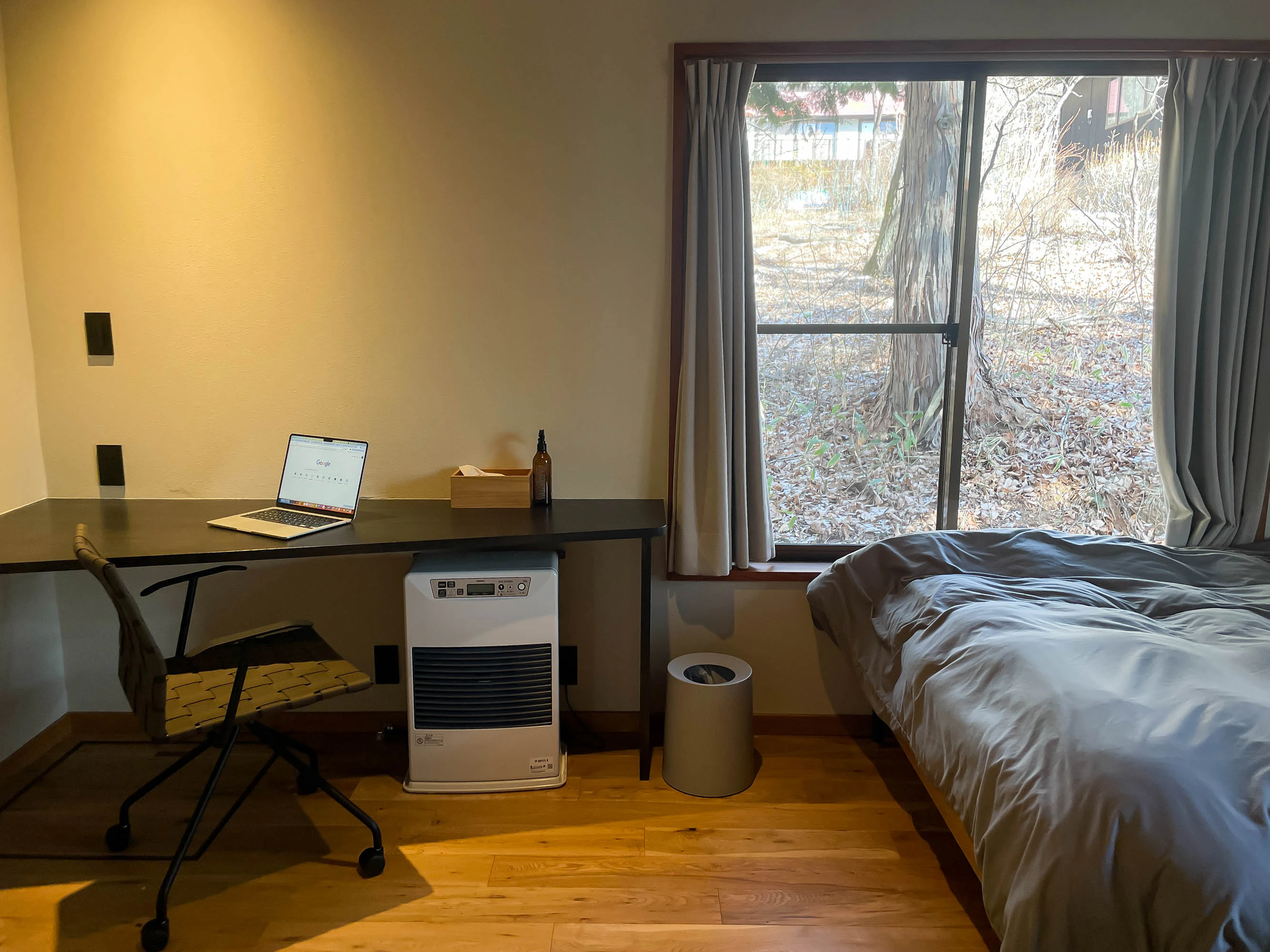 夕食の準備がととのったら、サウナの前に少しだけ仕事を。休日を満喫したいけど急ぎの仕事が……!という方のために寝室にはワークスペースが確保されています。しっかり集中できてとてもよかったです。