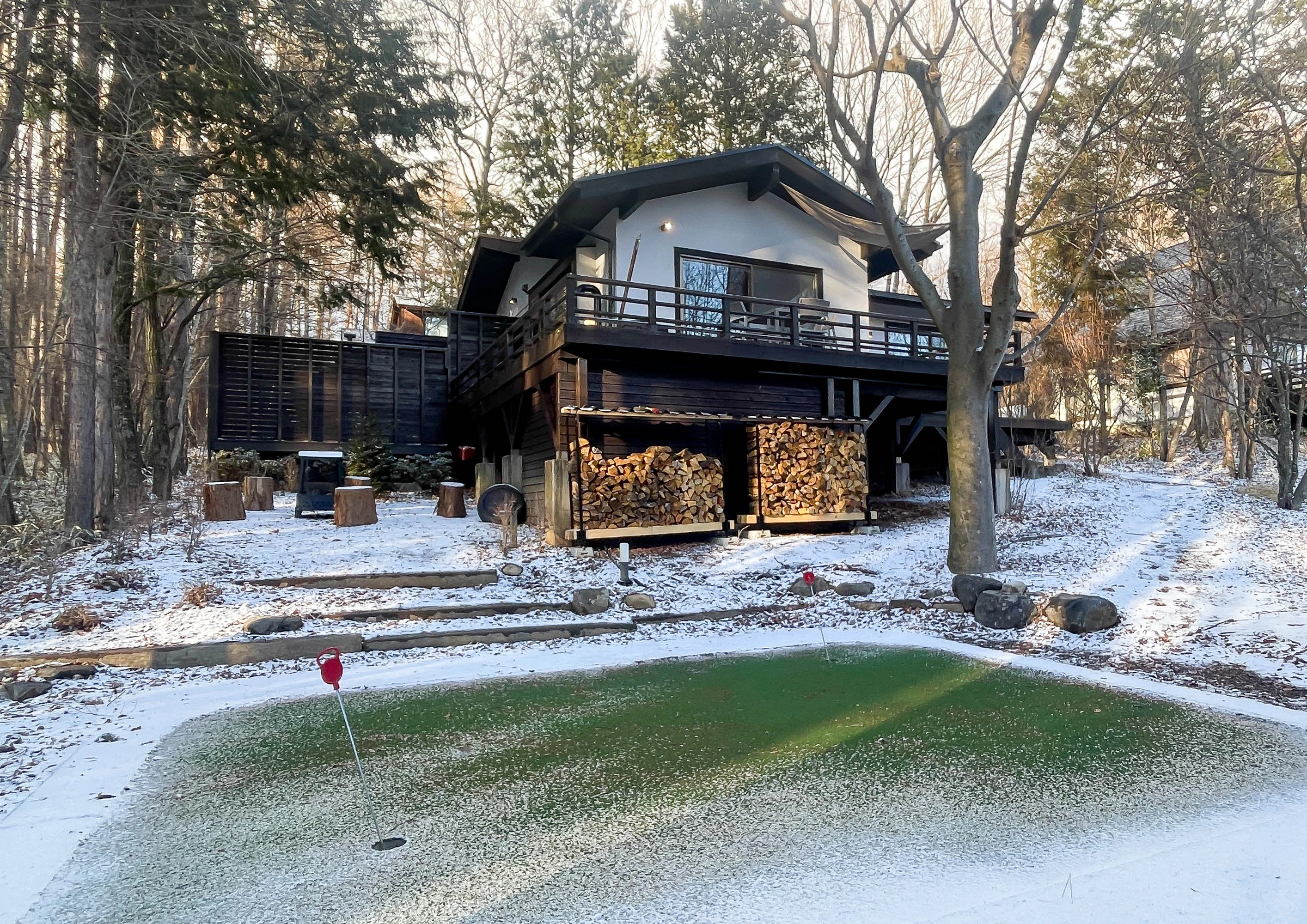 2024年8月末、山梨県北杜市大泉町谷戸にオープンしたプライベートヴィラ。広々としたリビングルーム、キッチン、バスルームなど一般的な設備のほか、薪サウナや焚き火台、テラス、パターゴルフスペースも完備。