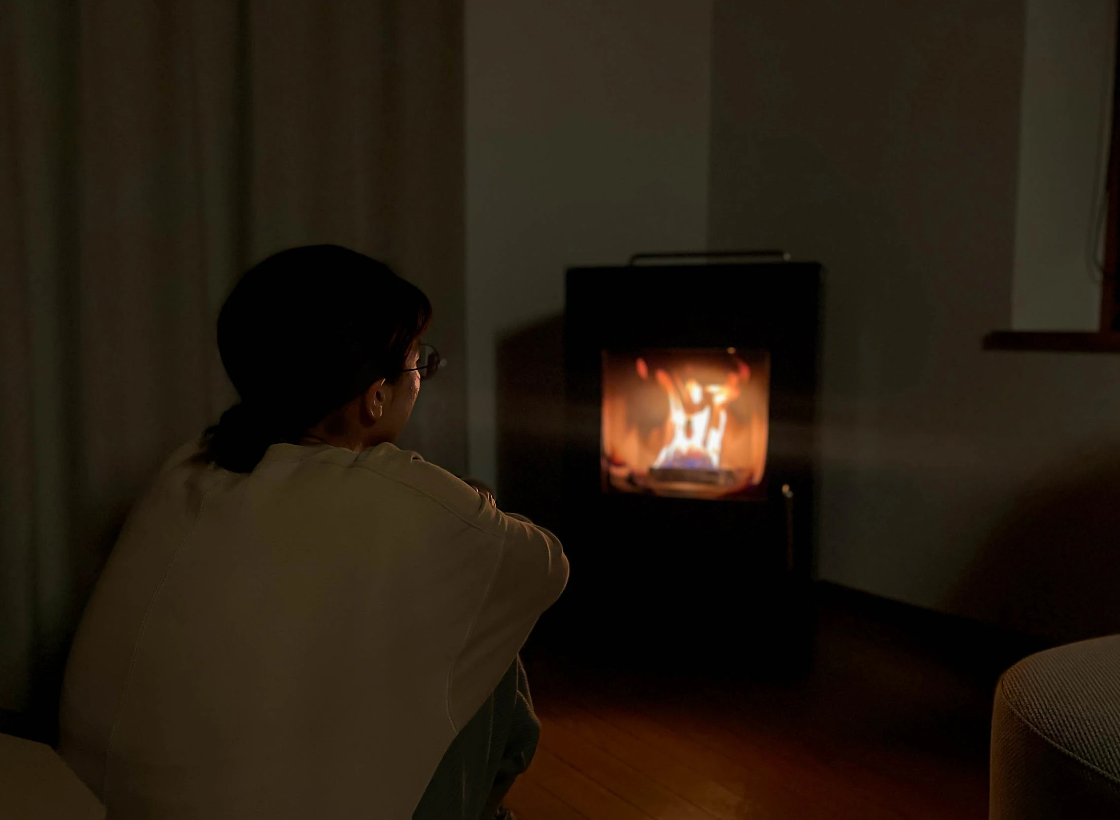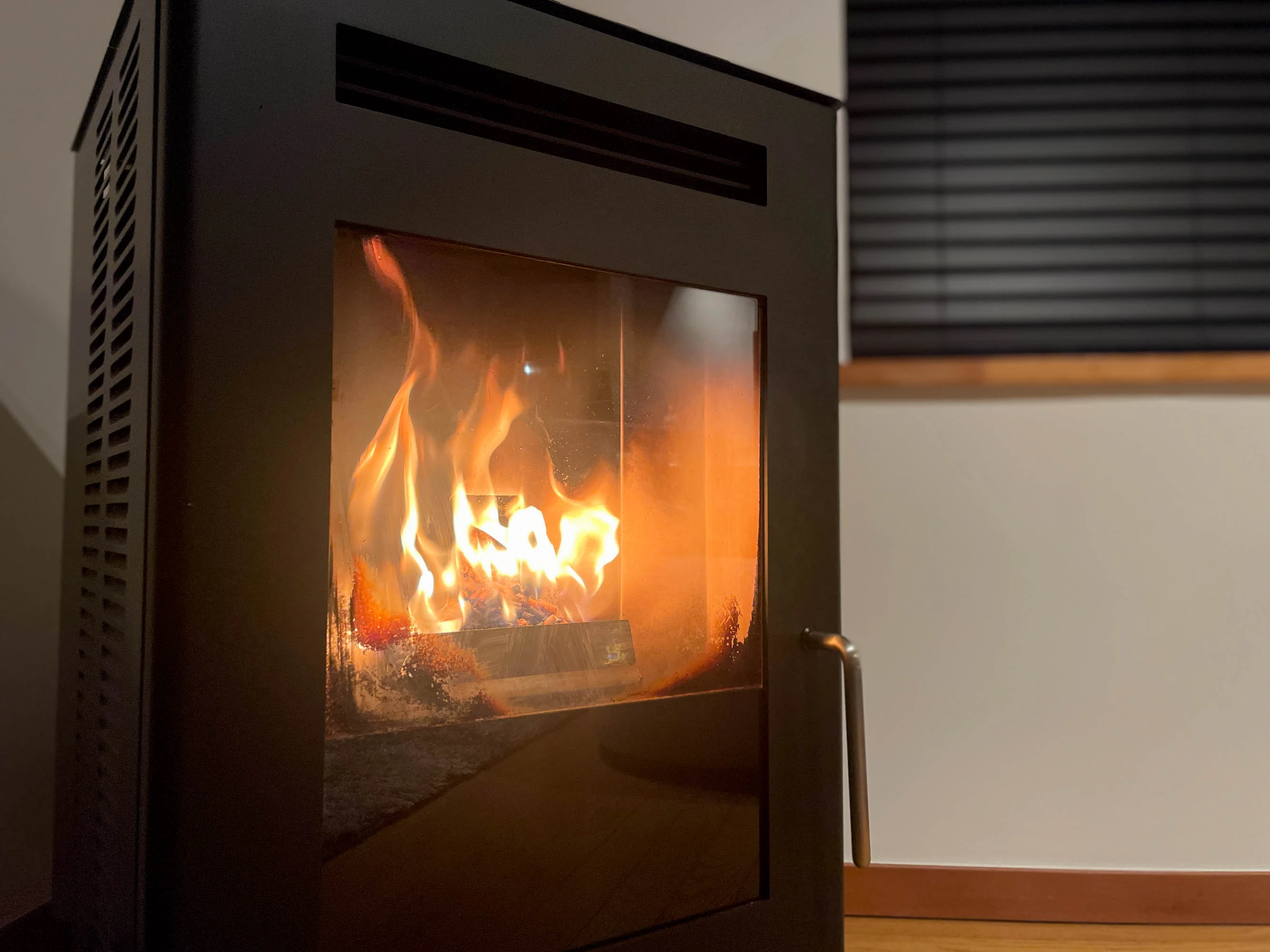 就寝前、ついつい時間を忘れてぼ〜っと見てしまったのが、リビングに置かれたこちらのペレットストーブ。上からポロポロと燃料が落ちてくる様子を眺めている時間に癒されました。