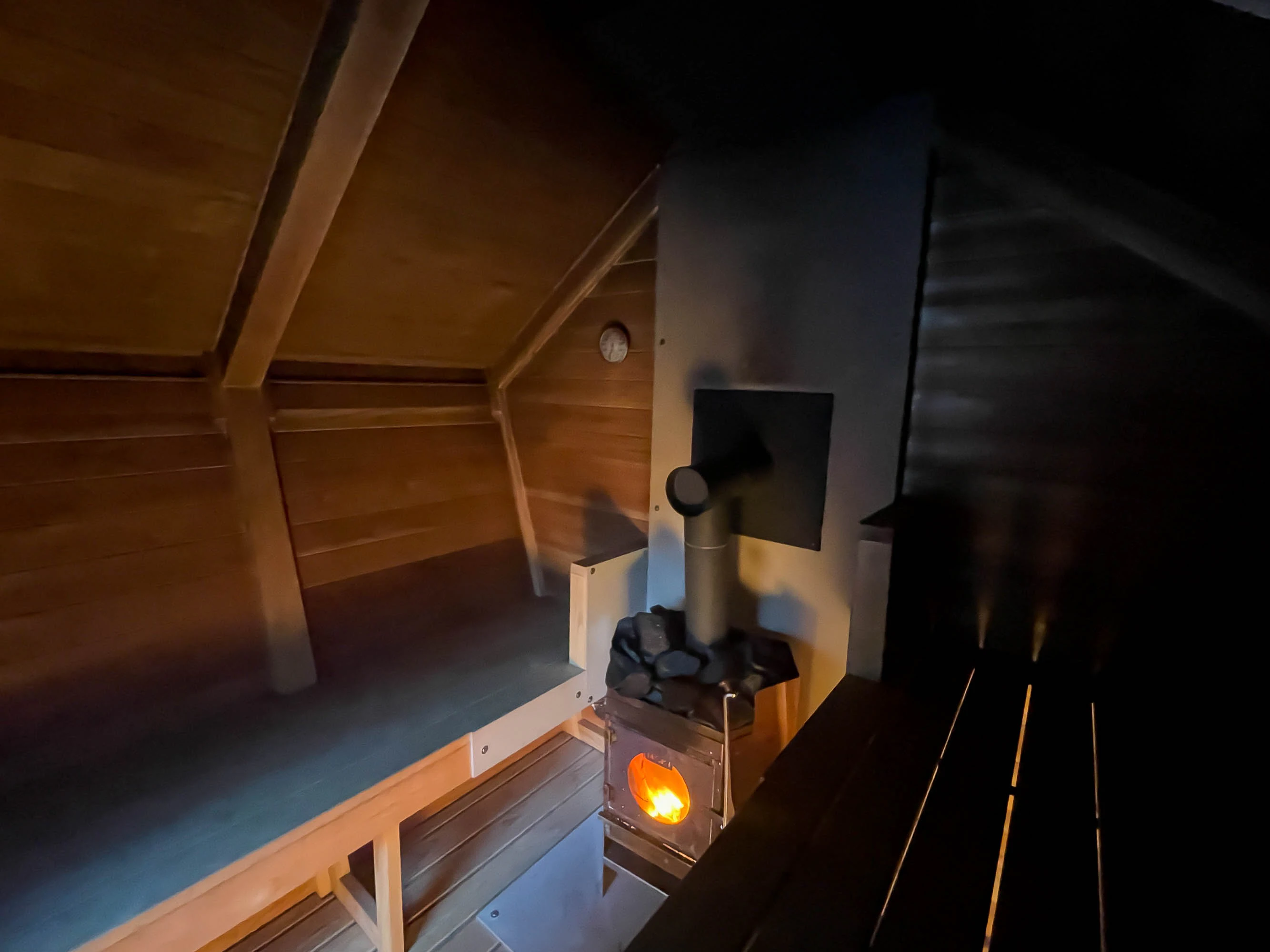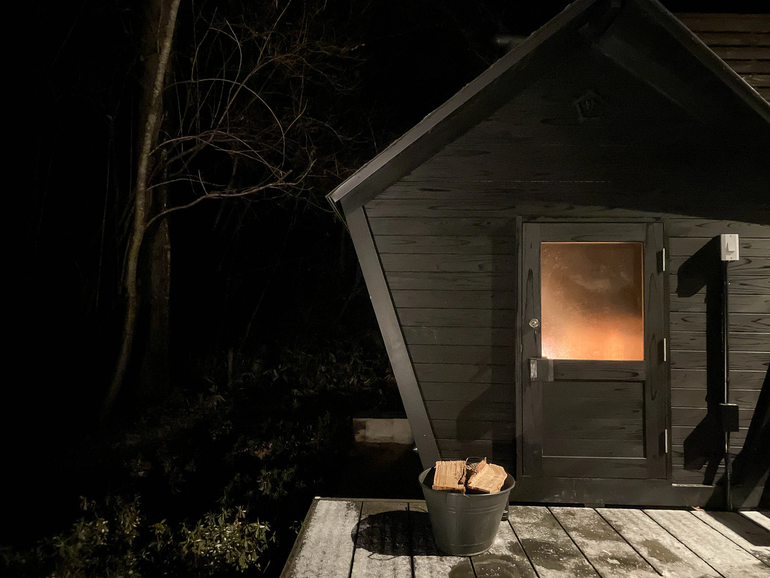 温度が安定してきたら、いざサウナタイム。やっぱり薪サウナの熱は、やわらかくて優しく感じられました。最小限の灯りのみなのも、とってもいい雰囲気。
