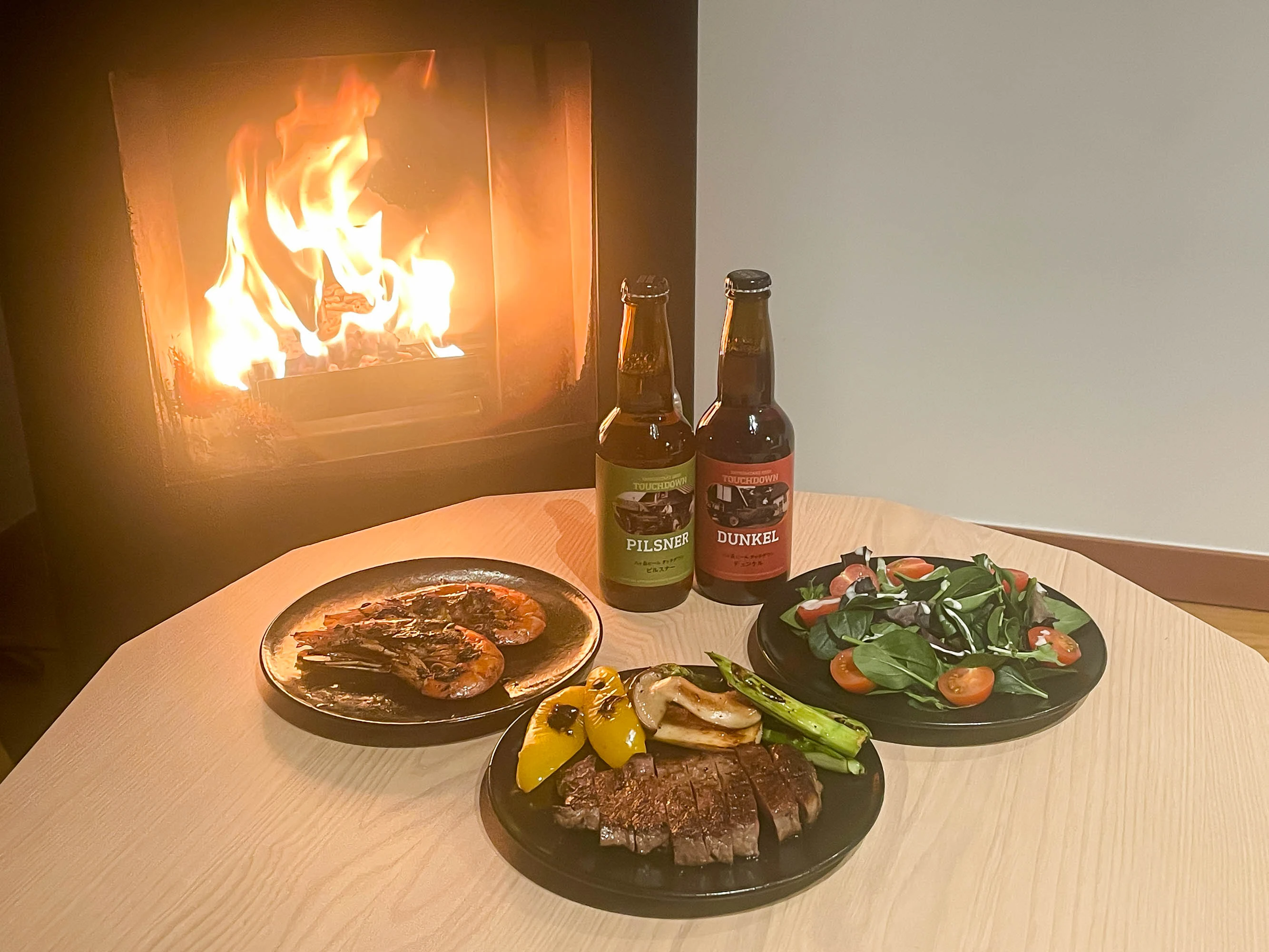 サウナを満喫したあとは、あったかい部屋でぬくぬく食事。お肉に魚介、サラダ、ご当地ビールを堪能。