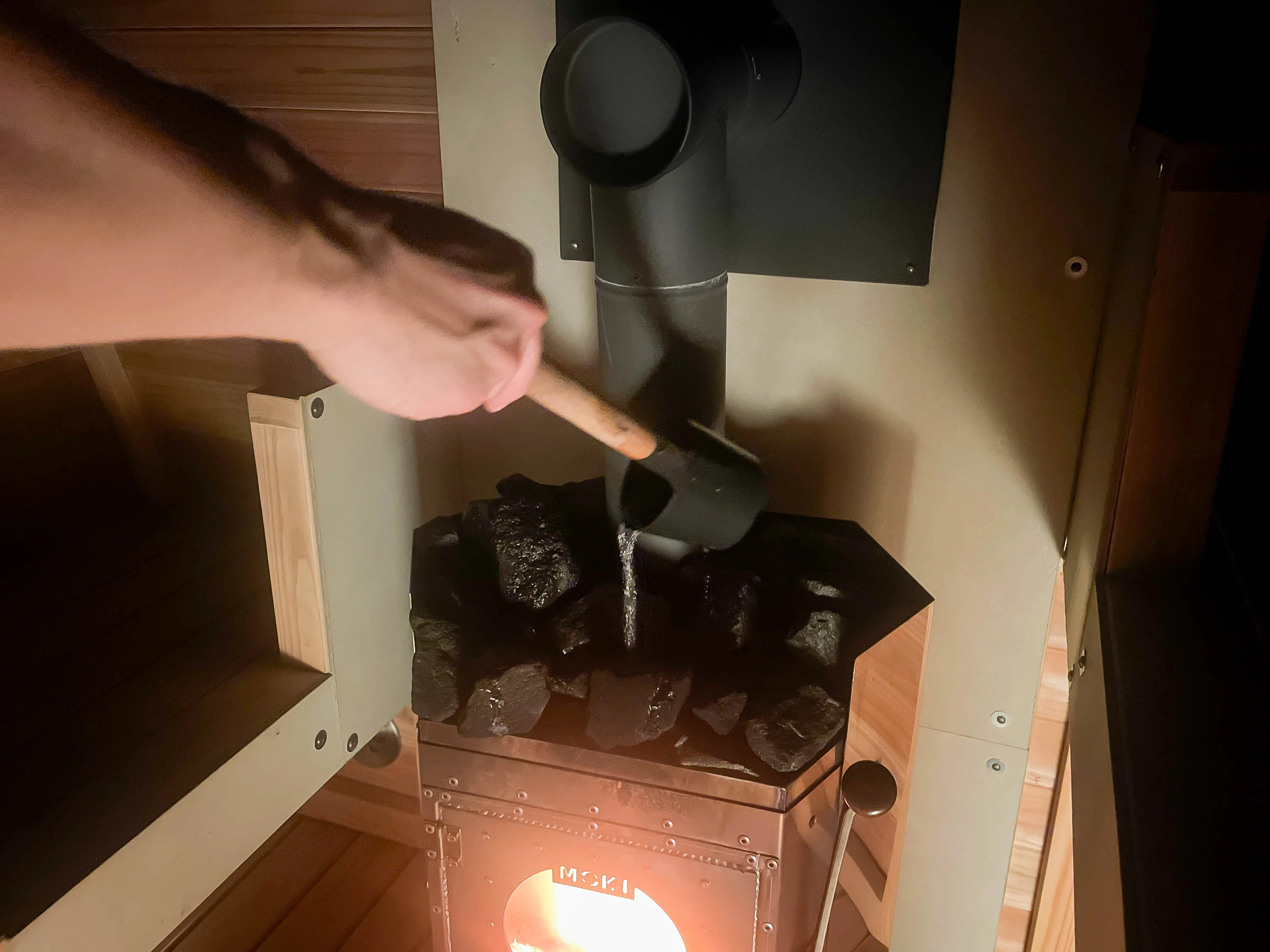 コンパクトな室内なので、ロウリュすると一気に室内の温度が上昇。室温は70度ほどでしたが、もう十分すぎるほどにしっかり温まりました!