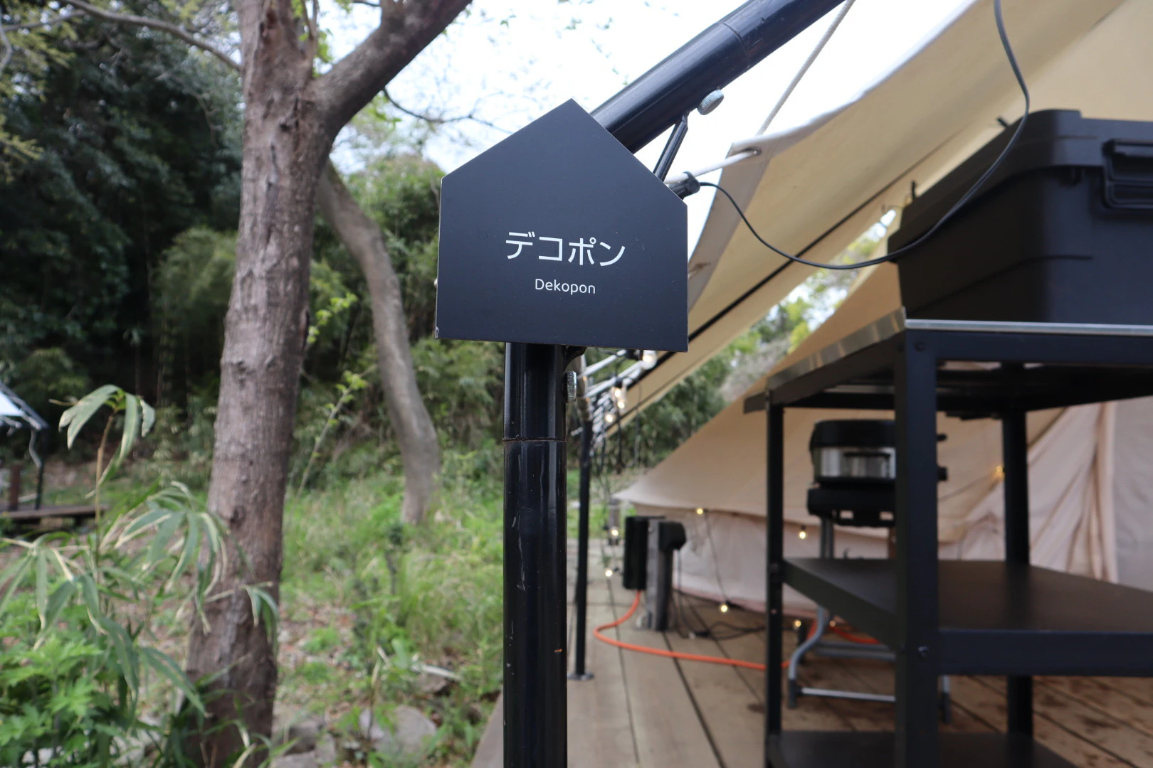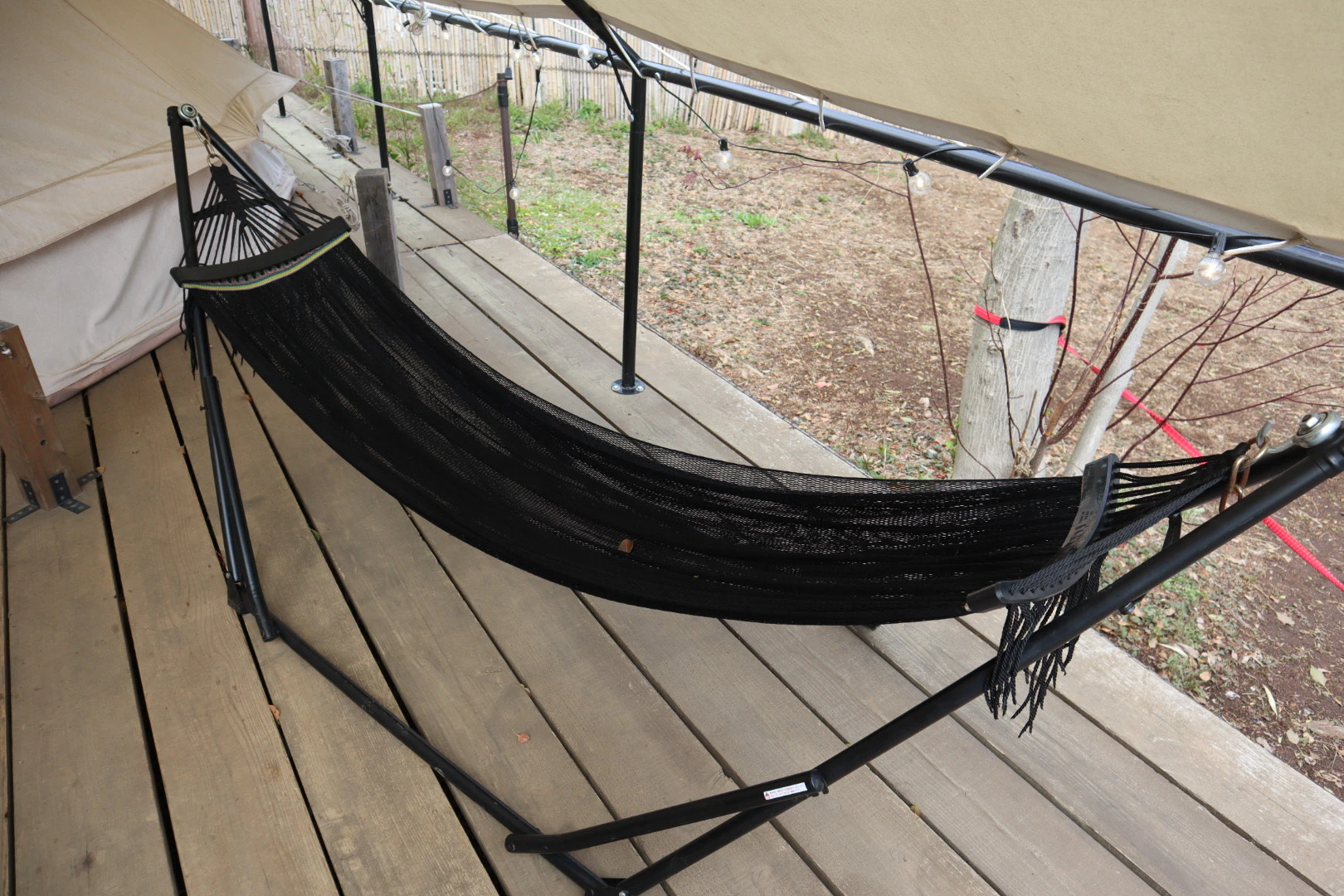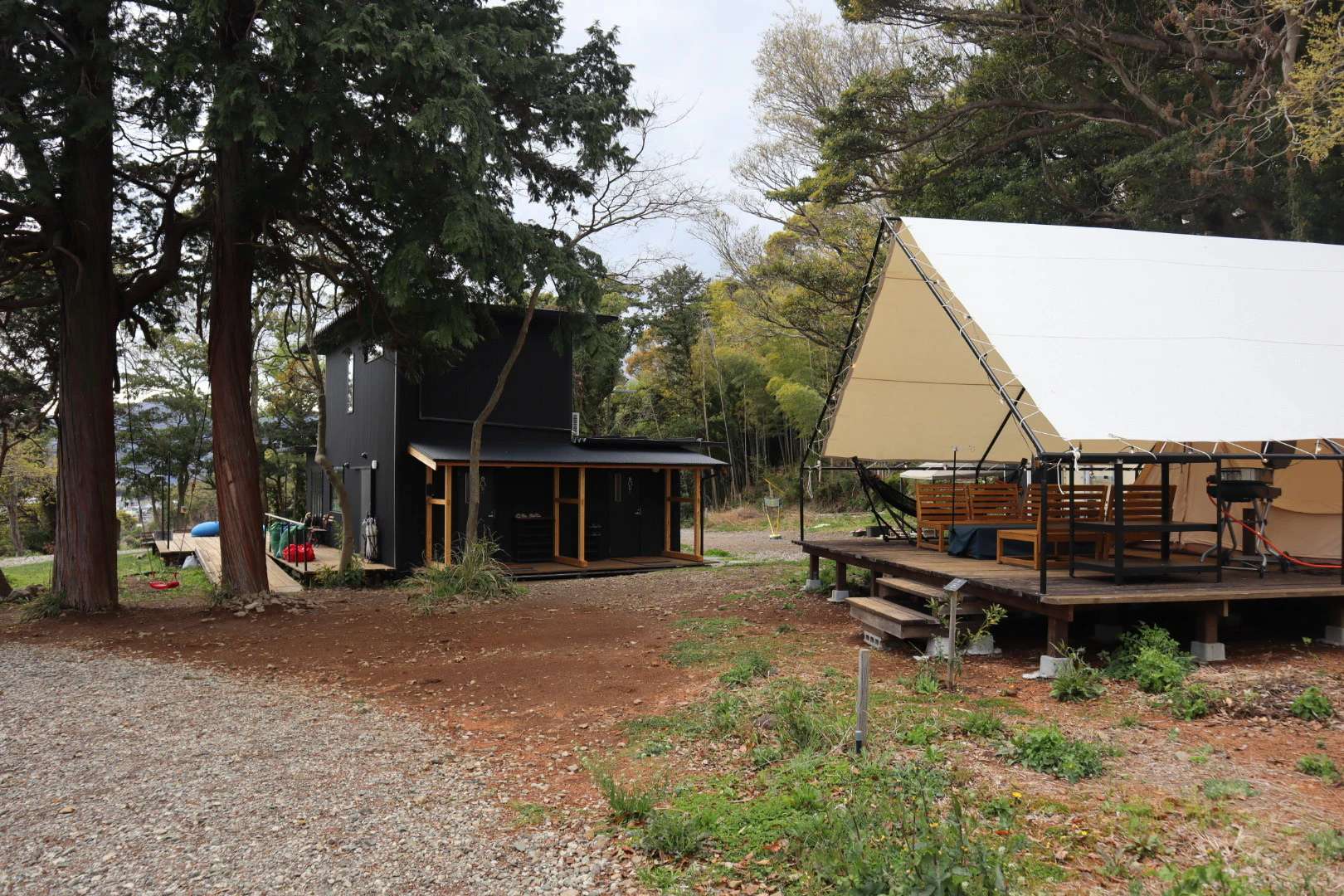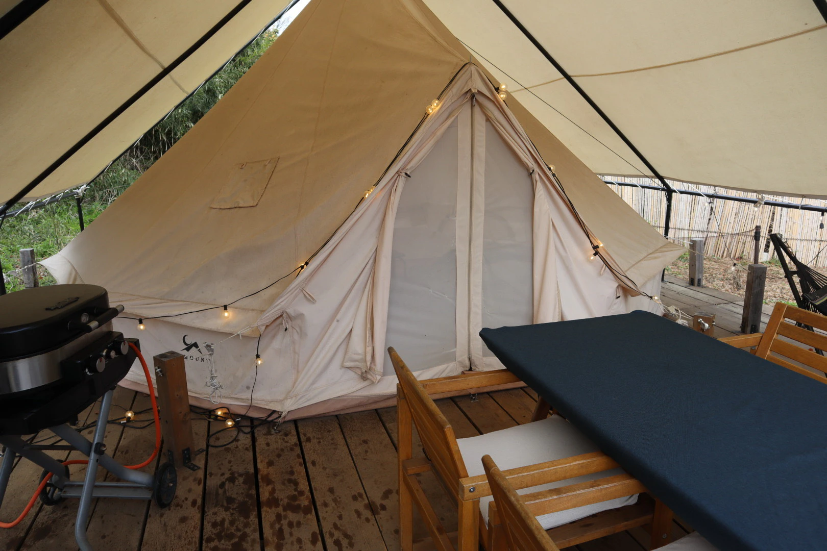 テントの前には椅子やテーブル、本格的なBBQグリルが置かれています。ハンモックもあるので、外でリラックスして過ごすのに最適なチルい空間です。