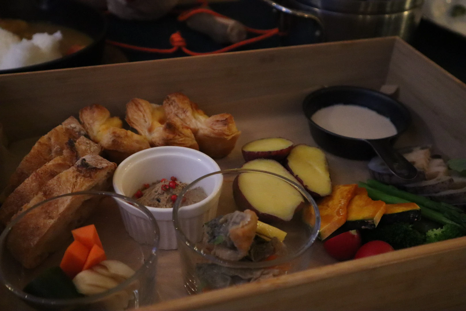 コースはまず前菜からスタート!ピクルスやレバーパテ、キッシュなどおしゃれな料理が箱型のボックスに入って登場します。バーニャカウダのソースは濃厚で、野菜の甘みを引き立ててくれる味付けでした。
