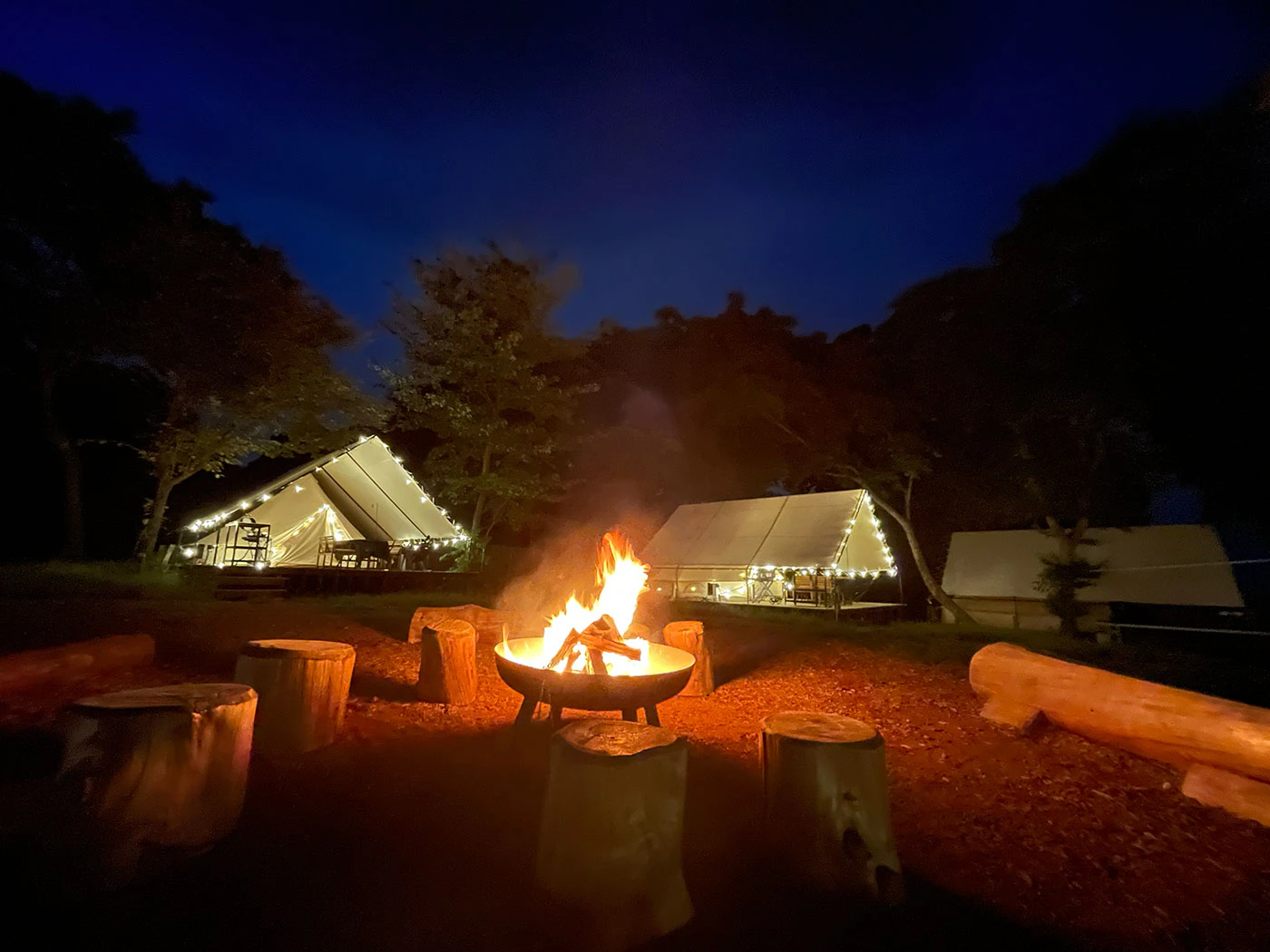 テントの中心にあるファイヤープレイスでは、毎晩焚き火イベントを開催。焚き火を囲みながら、ゆらめく炎を眺めたり、マシュマロ焼きを楽しんだりと思い思いの時間を過ごせます。