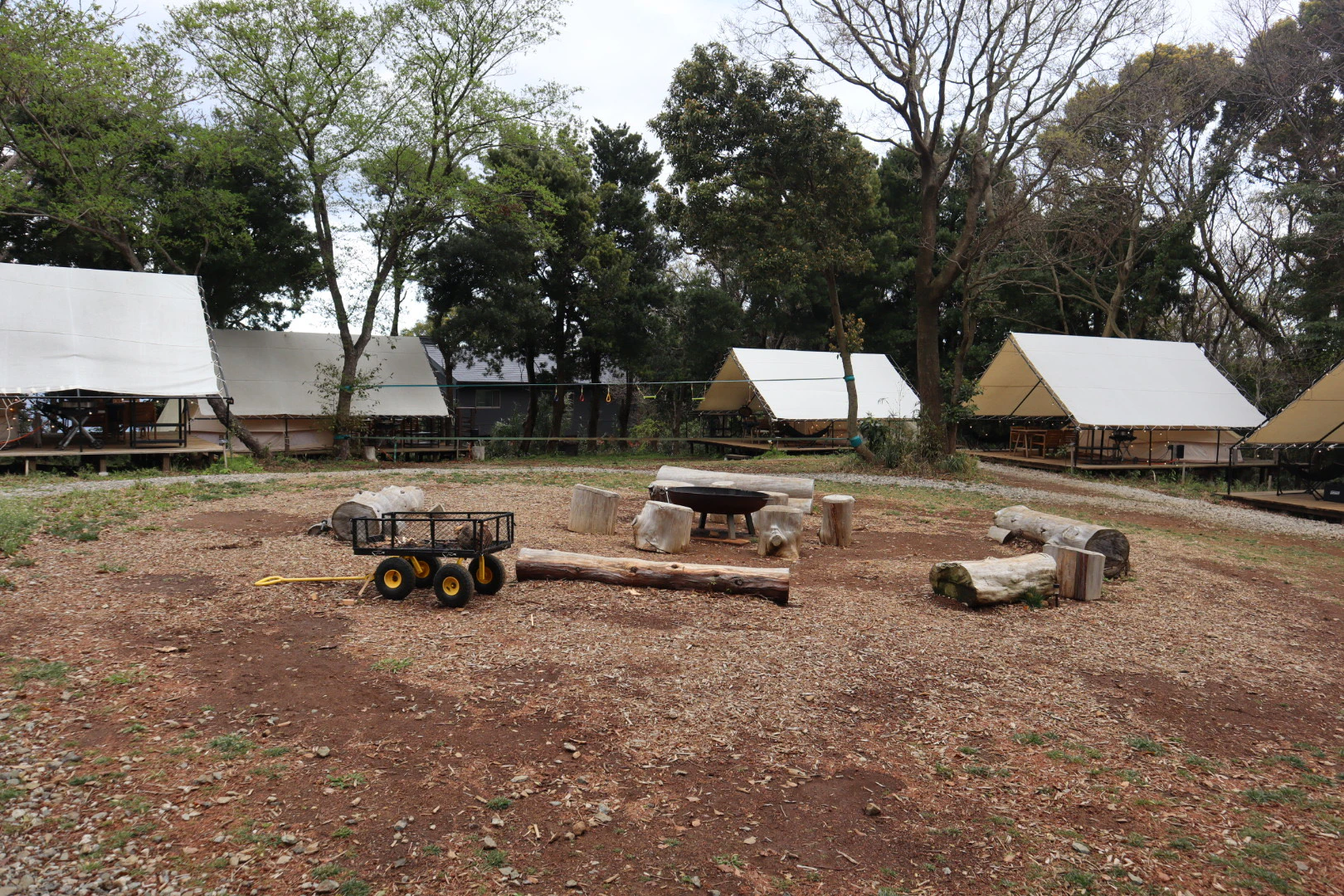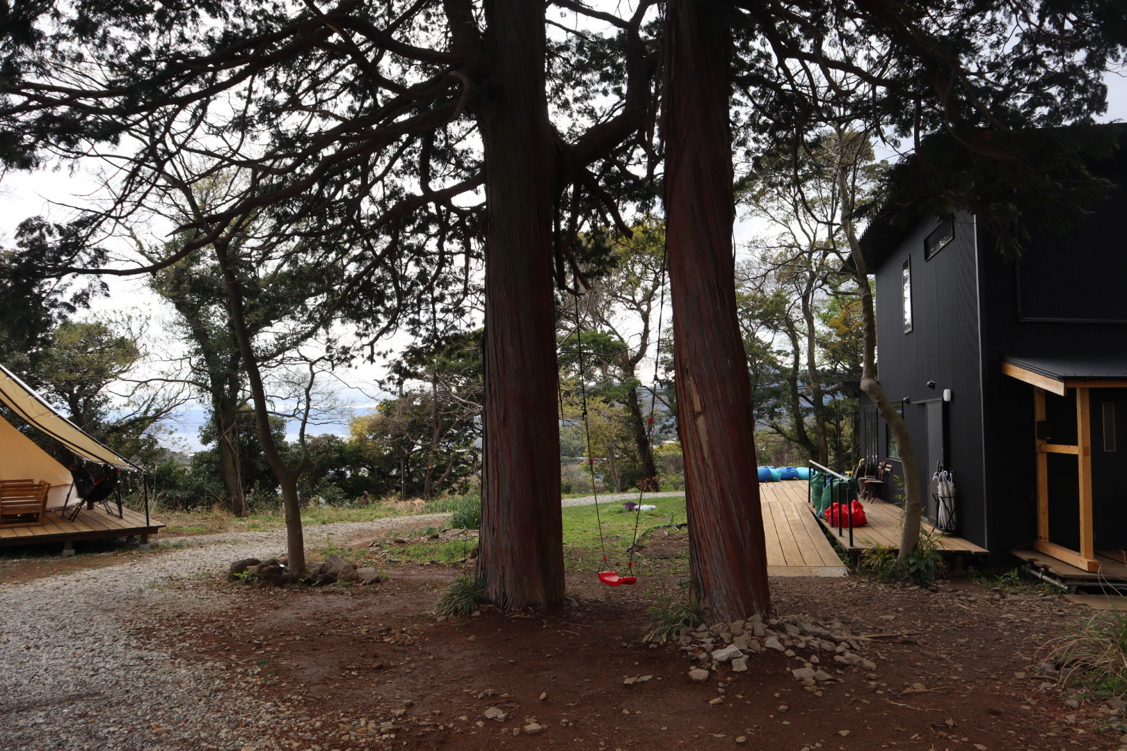 敷地内に入ると、中央のファイヤープレイスを取り囲むようにテントが並んでいます。ブランコや遊具コーナーもあり、子ども達が遊べる場所も盛りだくさん。カフェも併設されているので、家族でゆったりチル旅するのにぴったりの宿泊施設です。