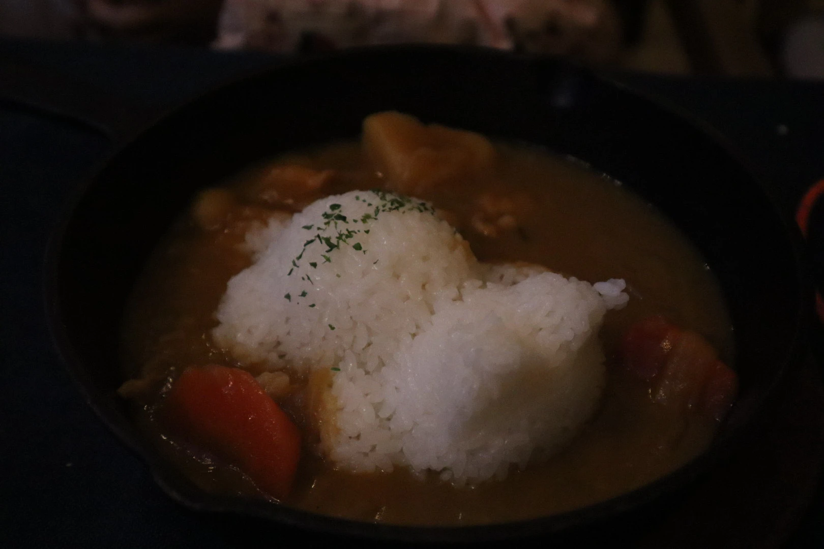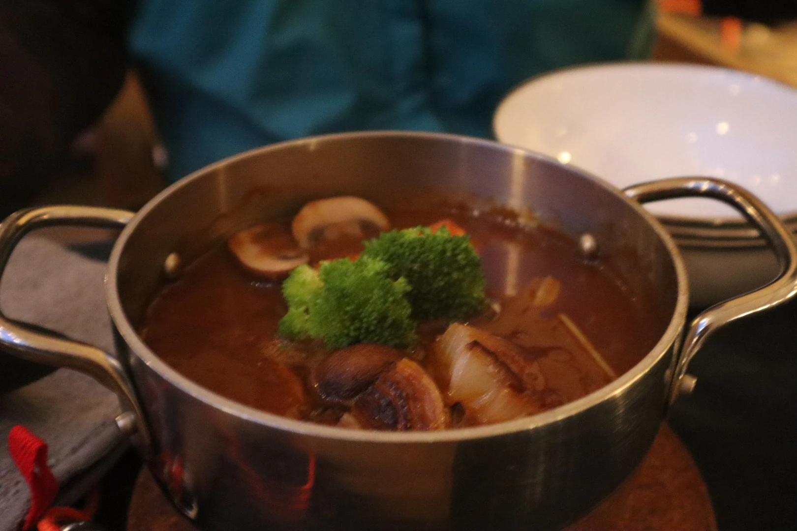 メインのシチューは保温性の高いダッチオーブンに入って、熱々のまま届きます。蓋を開けると、ゴロゴロした巨大な鹿肉と大きめにカットされた野菜がたっぷり。