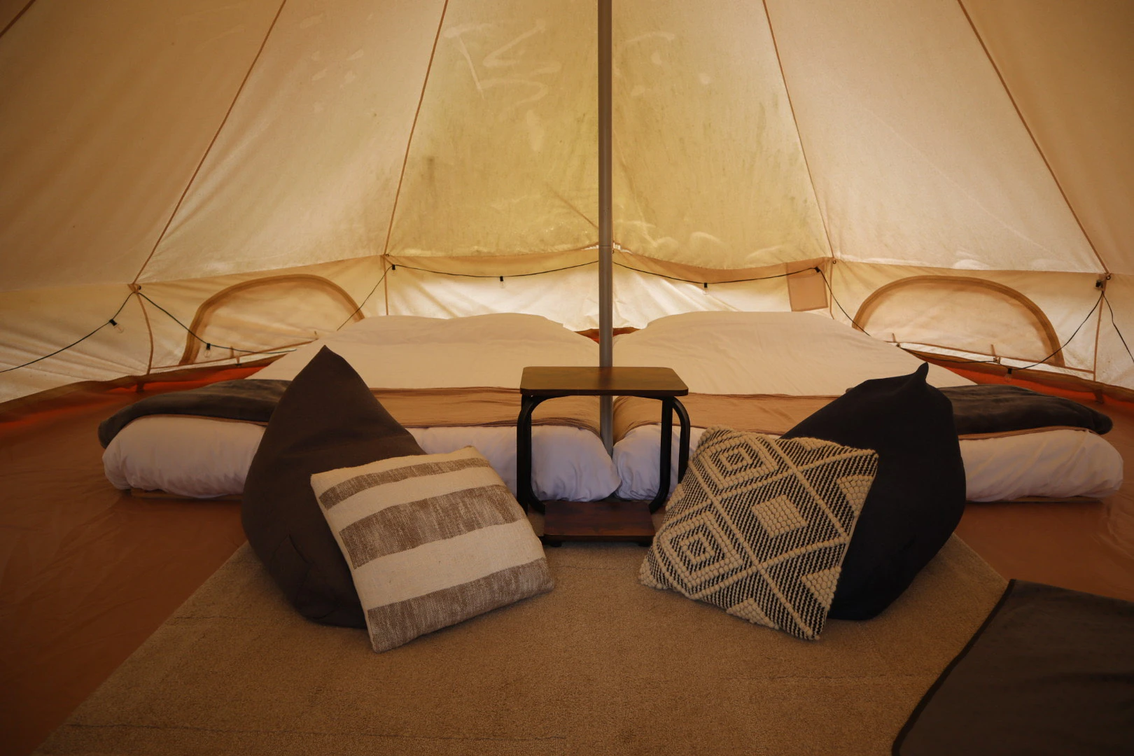 テント内は思ったよりもかなり広く、ベッドもふかふか。肌寒い日でしたが、ホットカーペットと電気ヒーター、ブランケットがあったので、ぬくぬくと過ごせました。