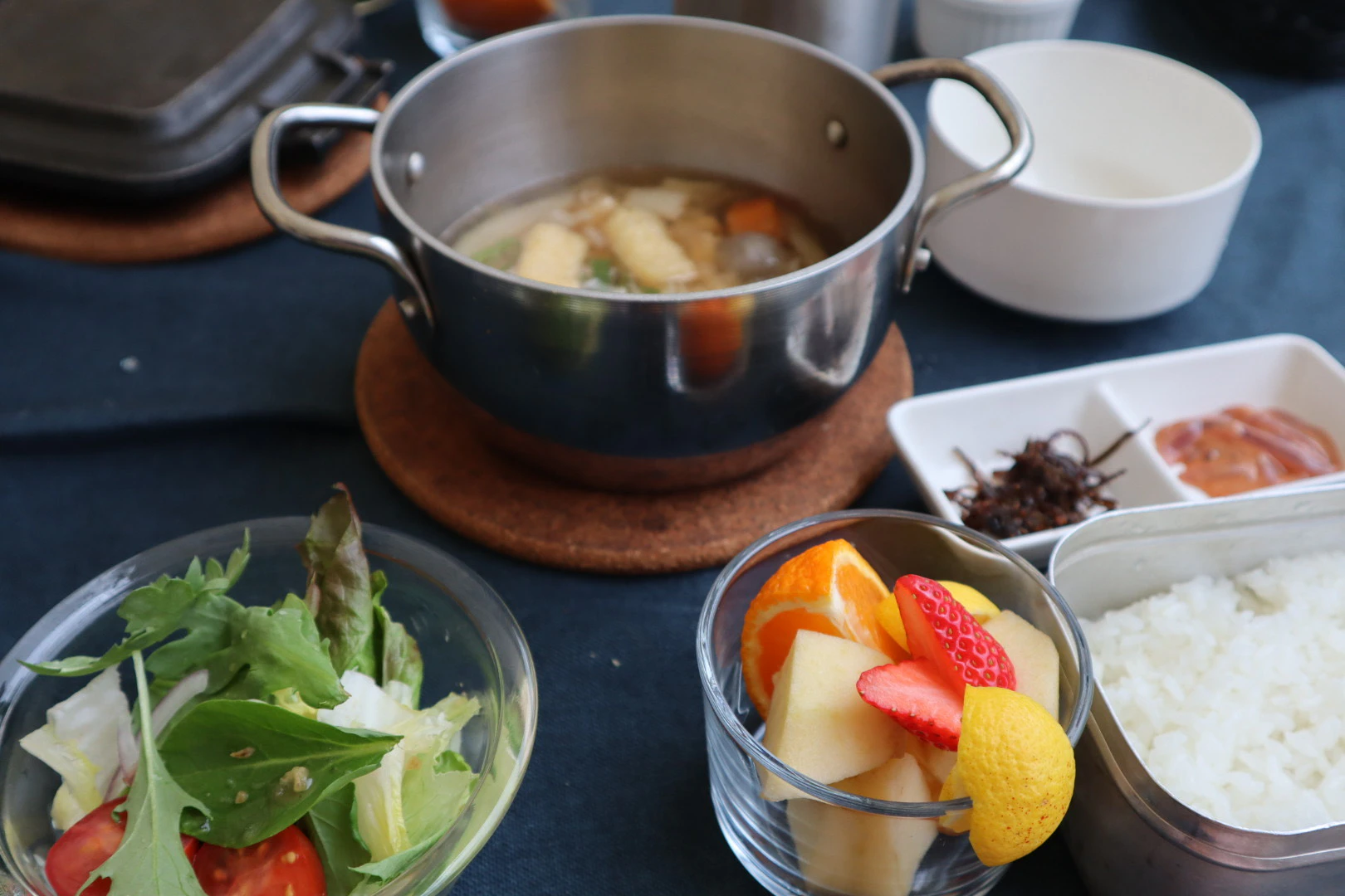 豚汁はダッチオーブンで提供されたので、最後まで温かく食べることができました。具沢山で味付けもやさしく、朝の少し冷えた体に染み渡るおいしさでした。パン食が続いていたので、久々のご飯にほっとした気持ちに。