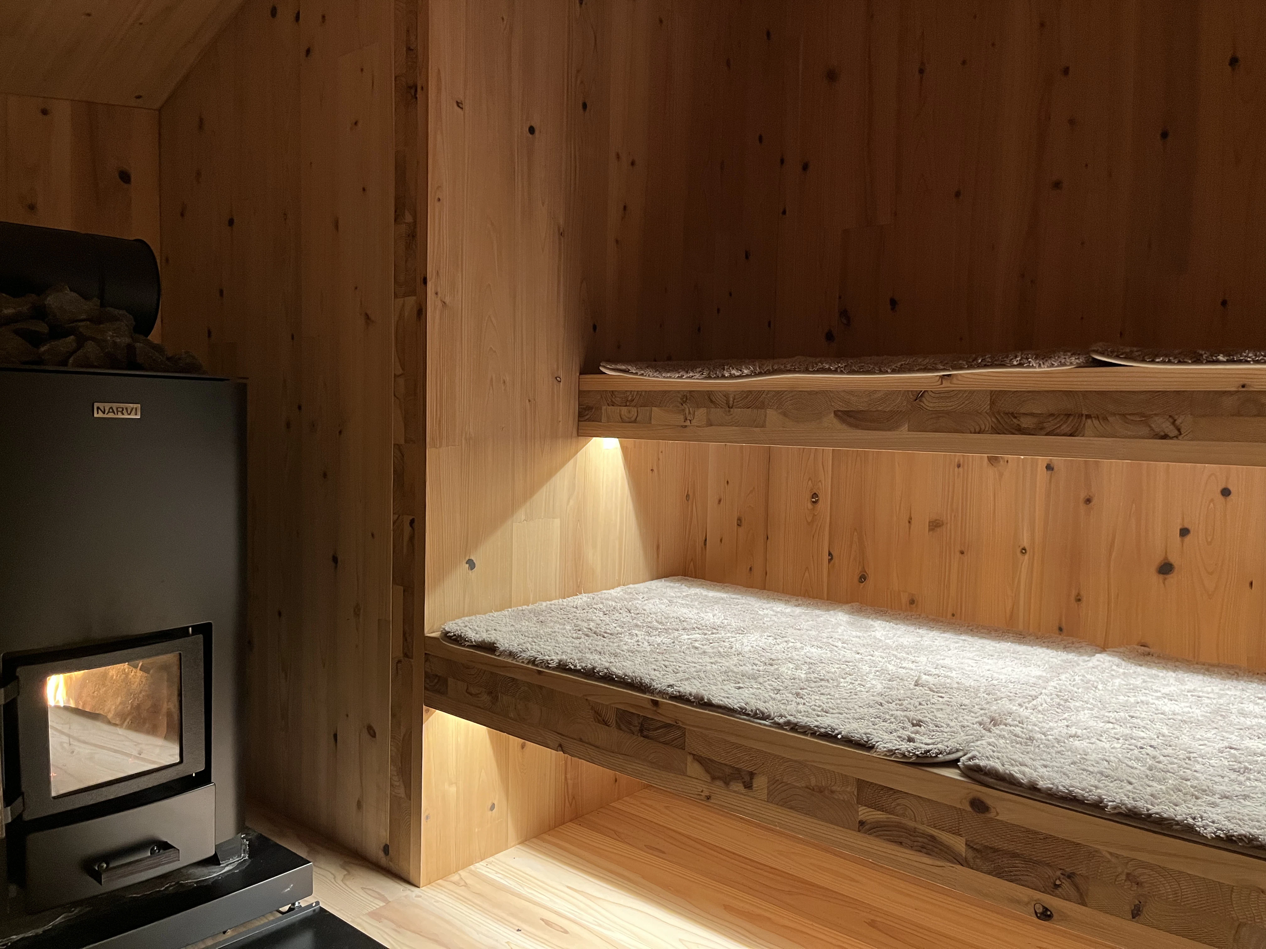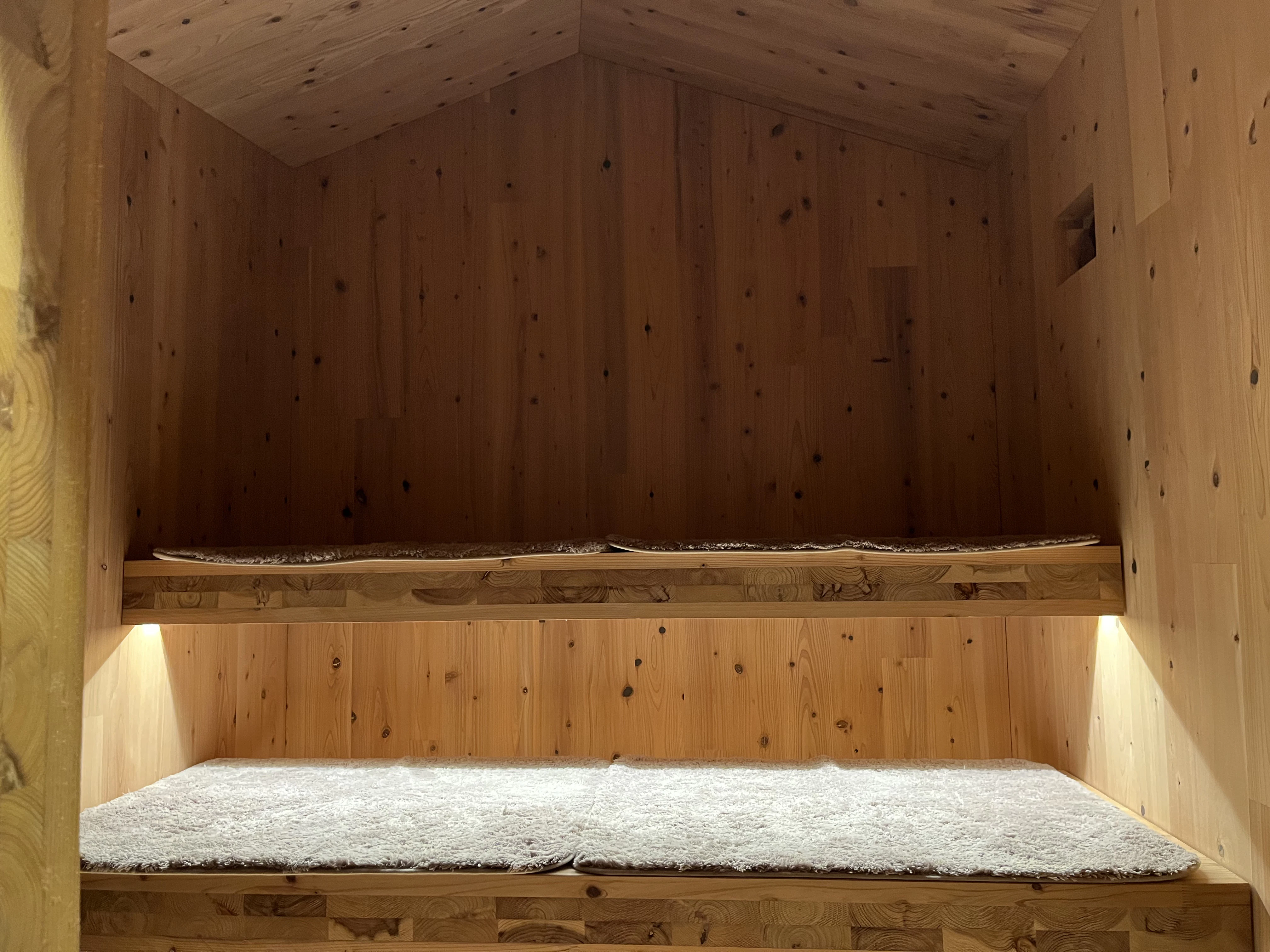 荷解きもそこそこに、いざサウナへ。サウナ室は2段ベンチで、ゆったりと過ごせる設計です。