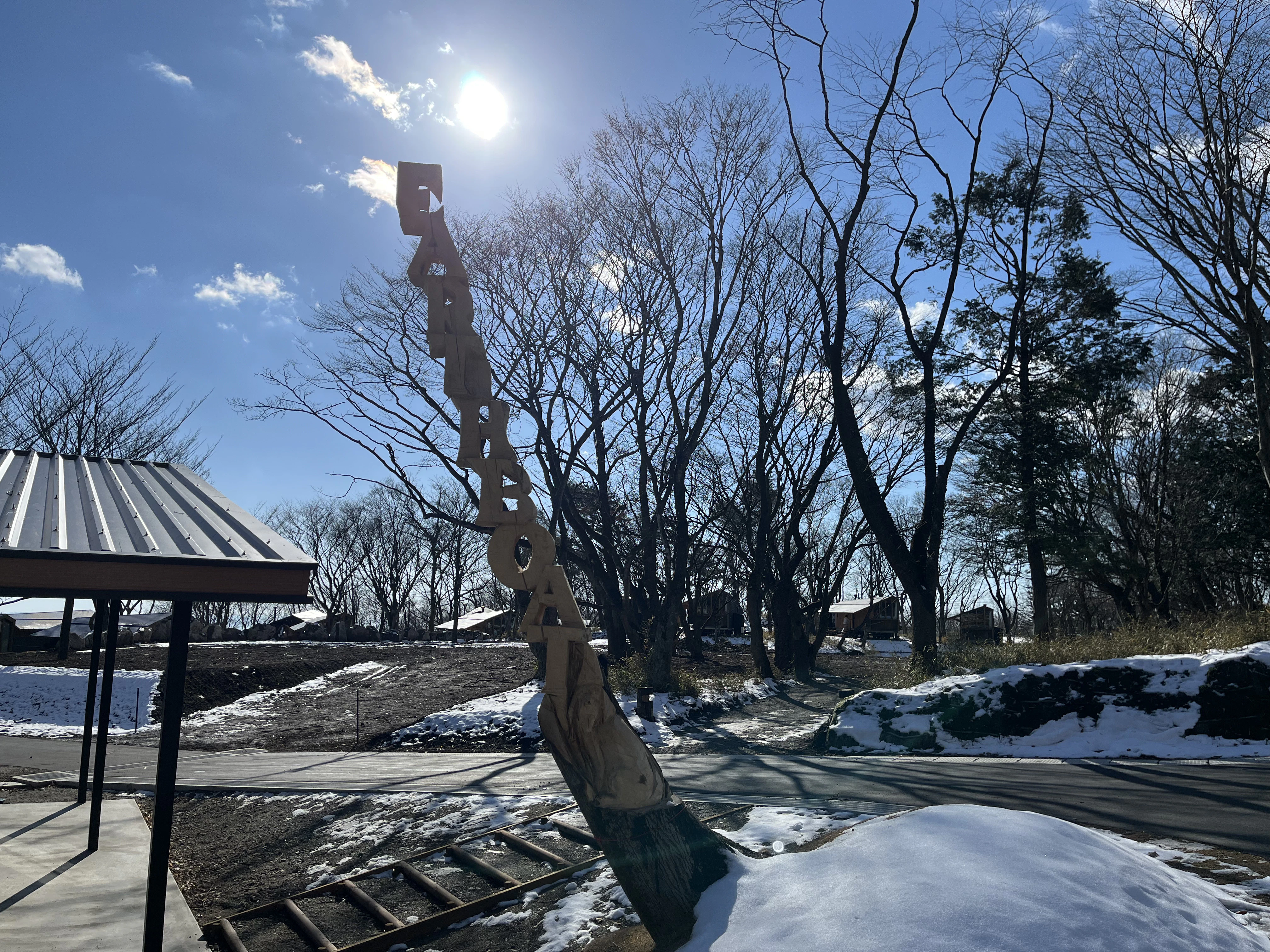 最寄りのバス停に降り立つと、ひんやりした空気が流れています。師走の那須はすでに雪が積もっていました。