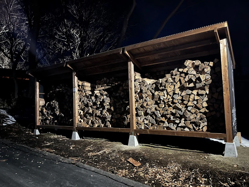 敷地内には薪が置いてあるスペースがたくさん。部屋の前に一式おいてありますが、使いきってしまった場合は追加購入も可能です。