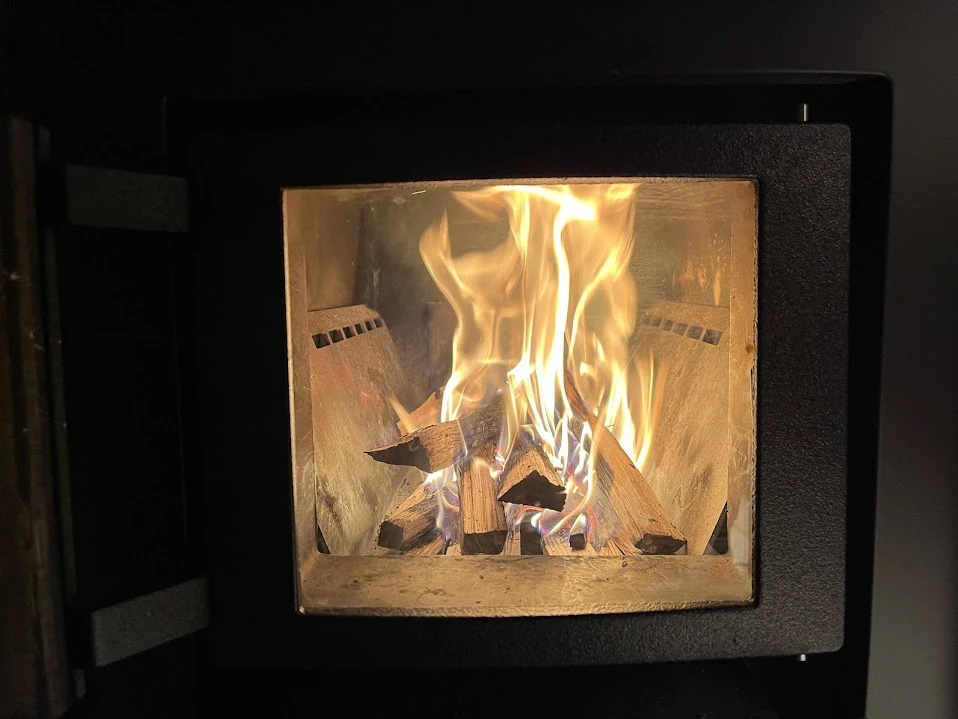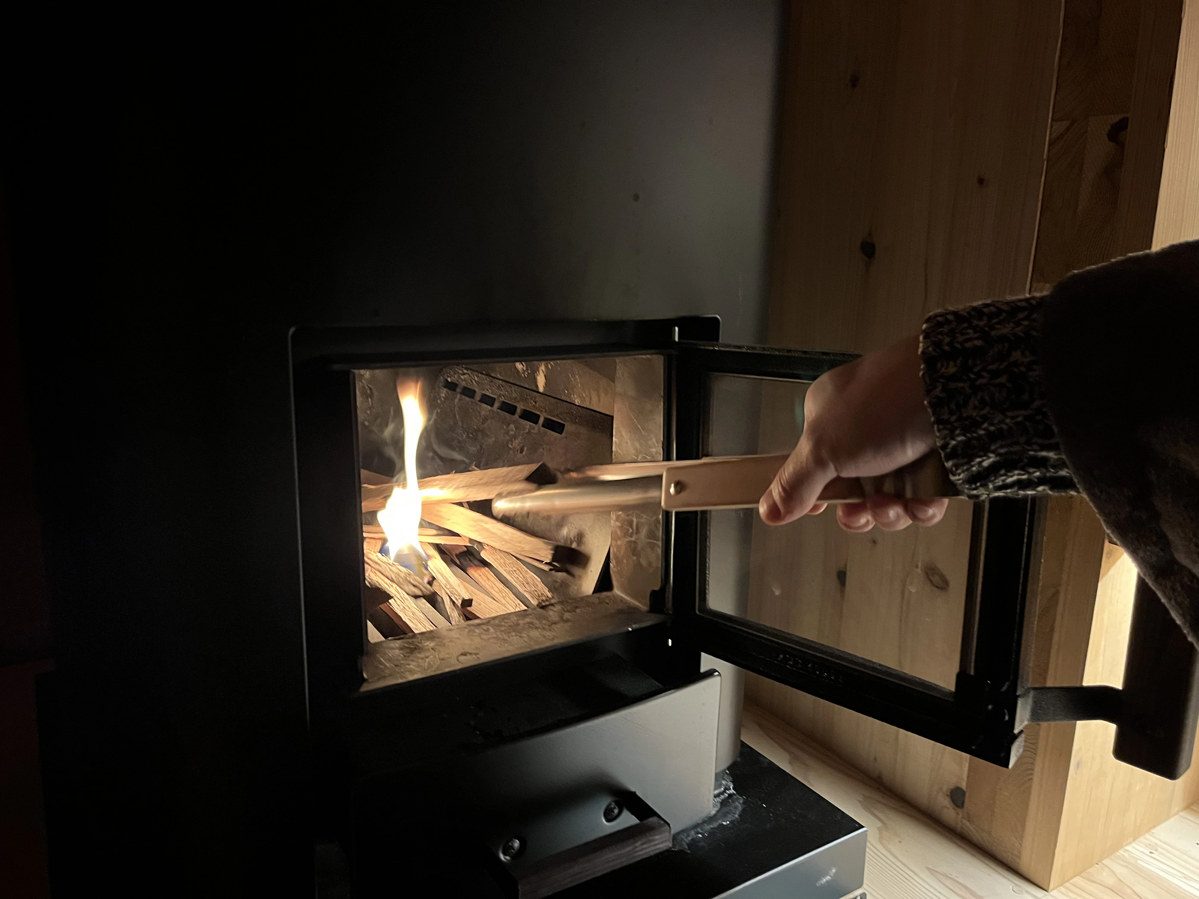 細い薪ができたら、着火剤とマッチを使ってストーブに火を入れます。火がついたら、薪がよく燃えるように位置を微調整。