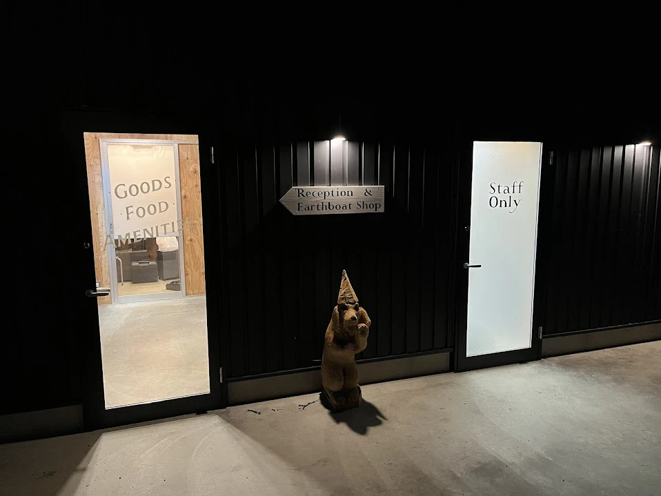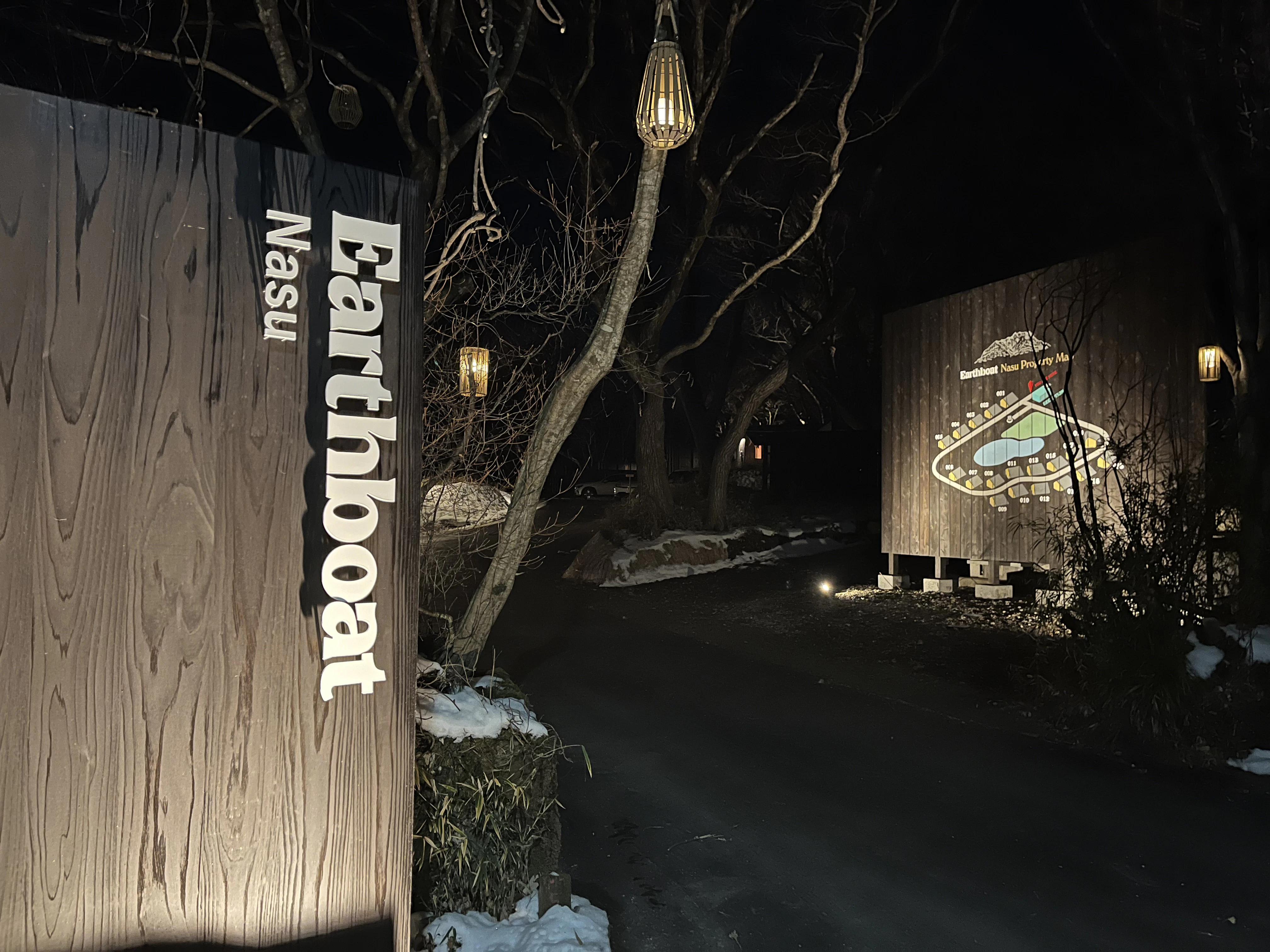 雪道を抜けて「Earthboat」の看板が見えたら到着です!敷地内には、全部で19の部屋があります。