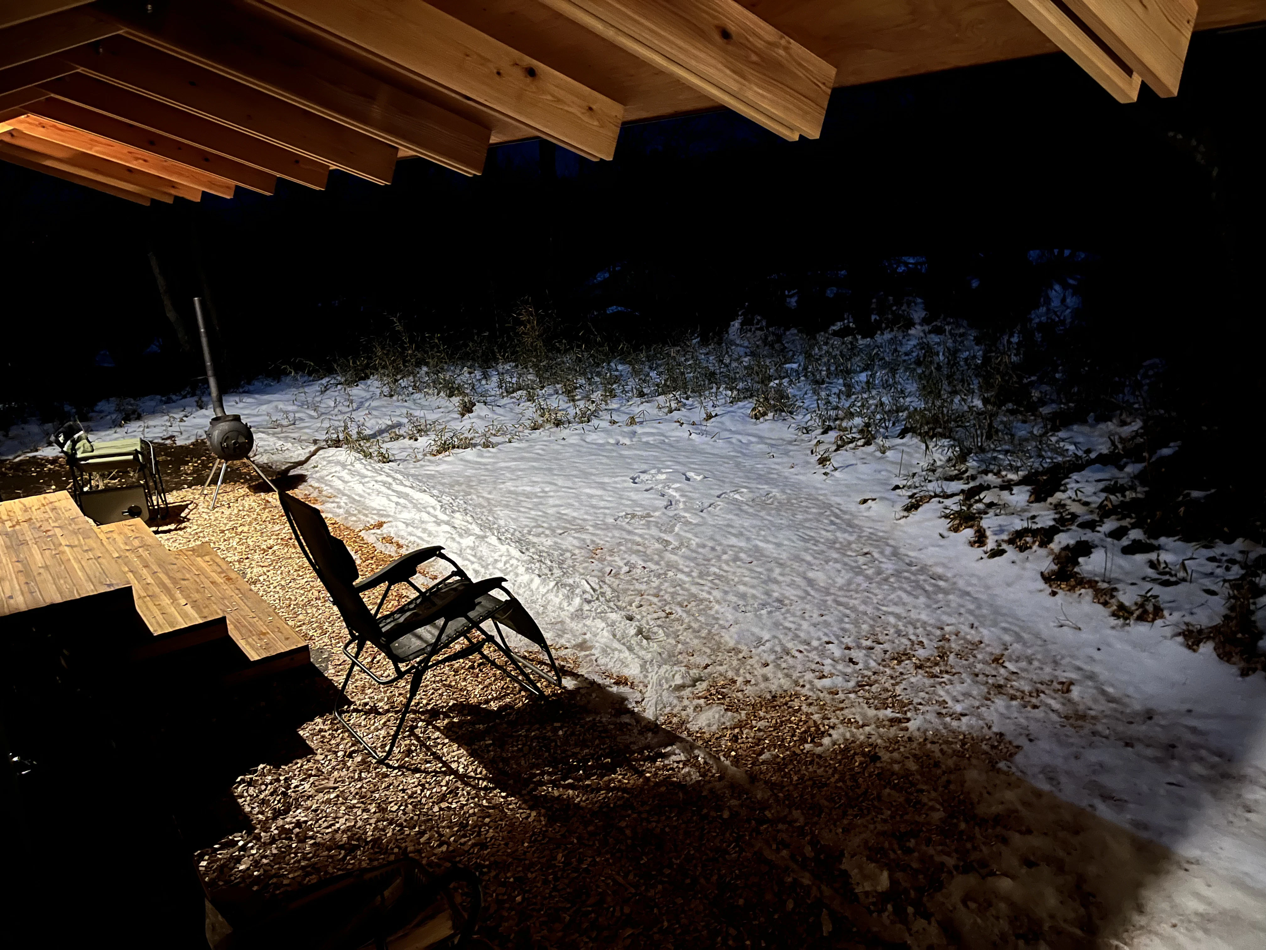 トレーラーハウスの前にあるインフィニティチェアを設置。ポンチョを羽織って身を預けます。