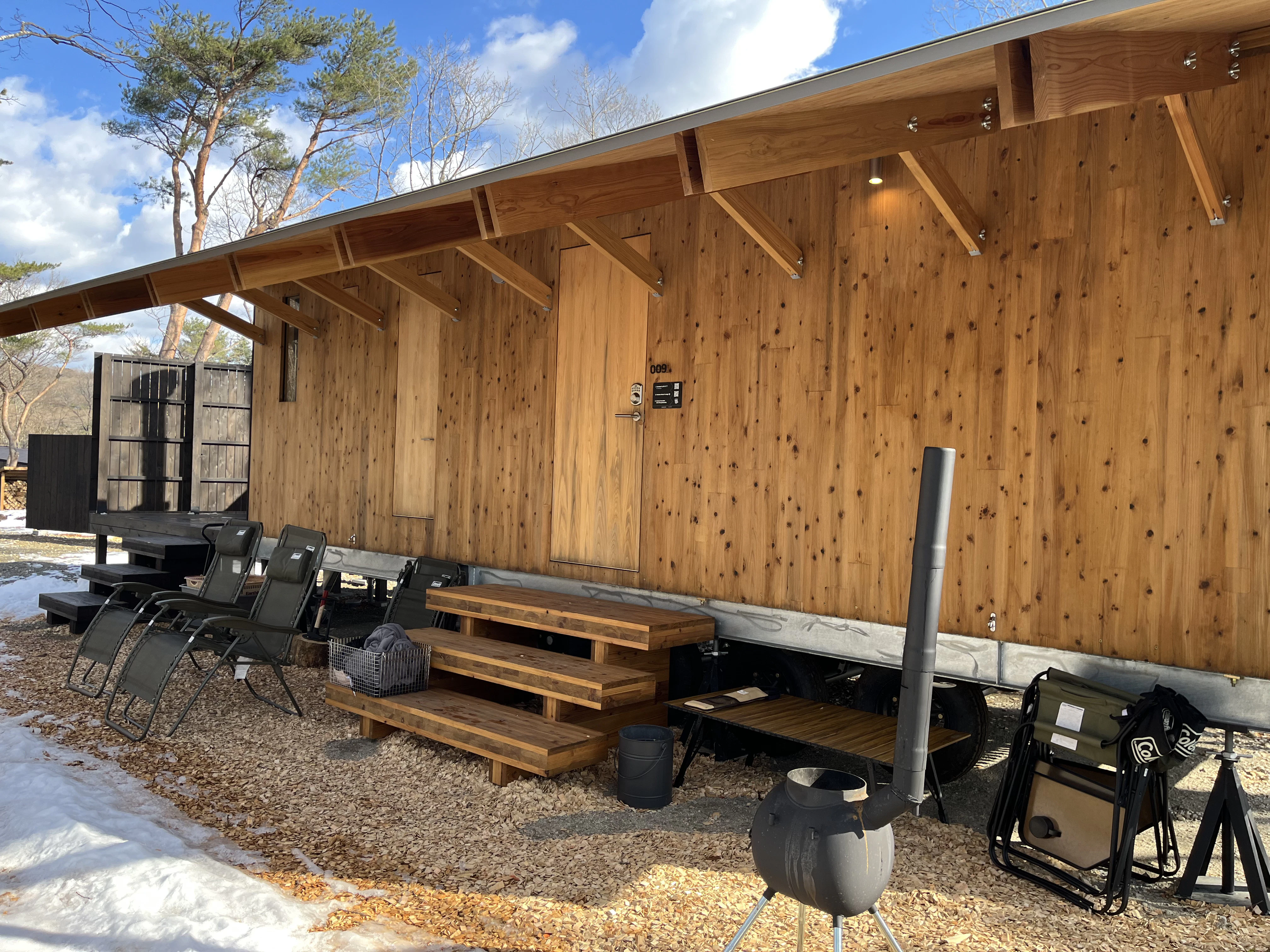 そのまま指定された部屋へ向かうと、どっしりとしたトレーラーハウスが佇んでいます。手前には水風呂とサウナ小屋が見え、期待が高まります!