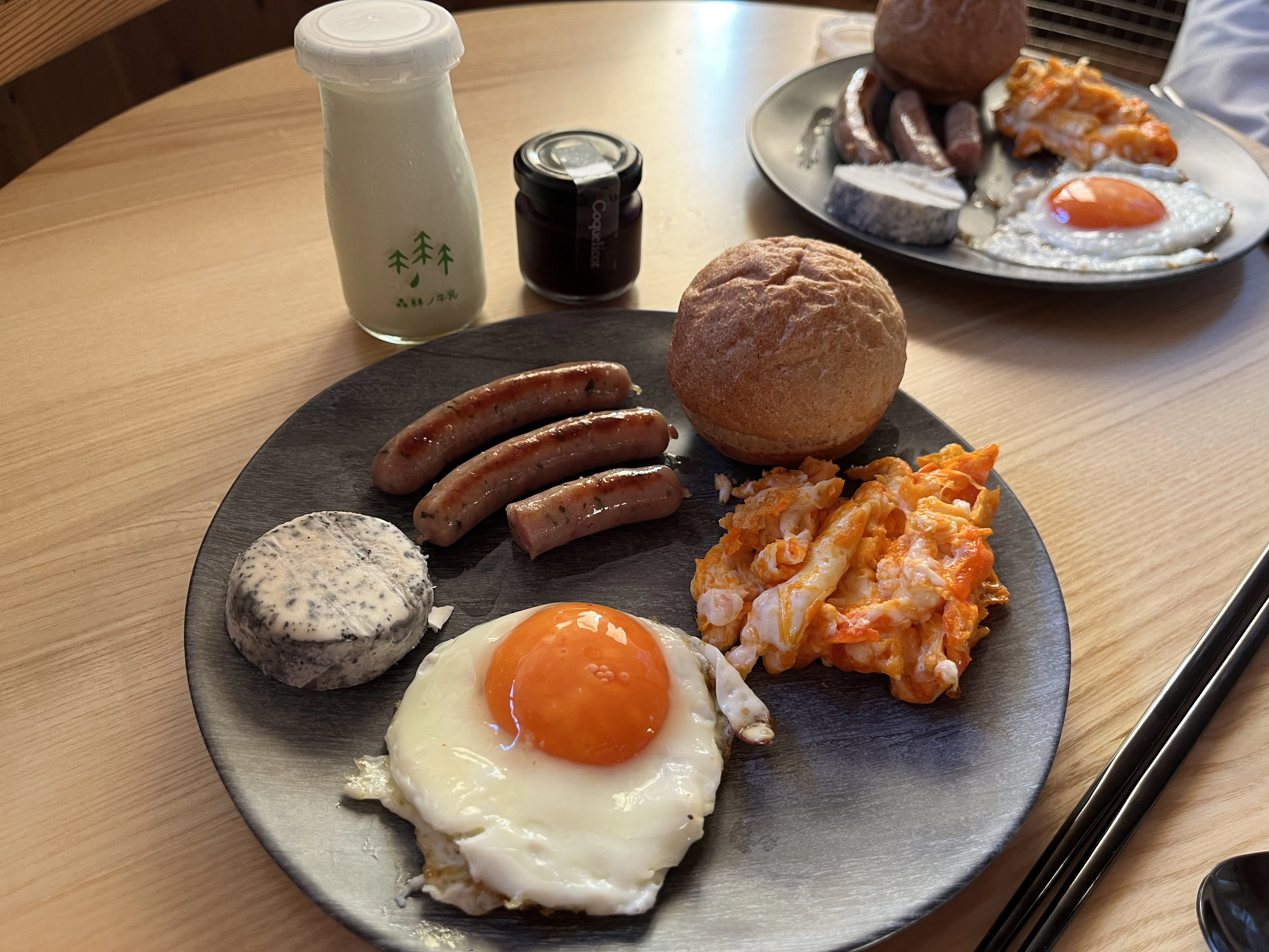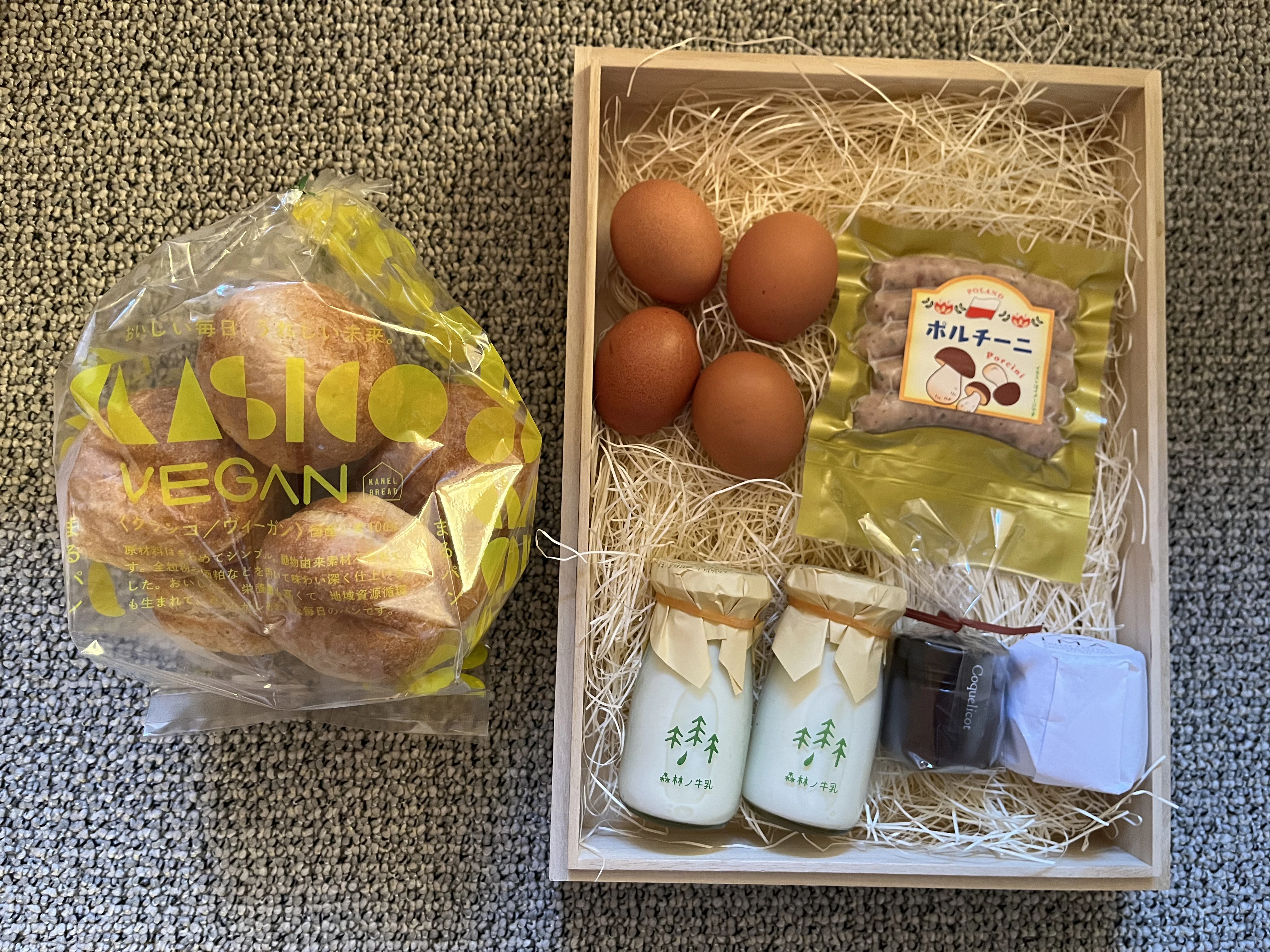メニューは、ヴィーガンの丸パン、濃厚な卵、ポルチーニウィンナー、チーズ、ジャム、牛乳のセット。どれも地元の選りすぐりの食材ばかりです。