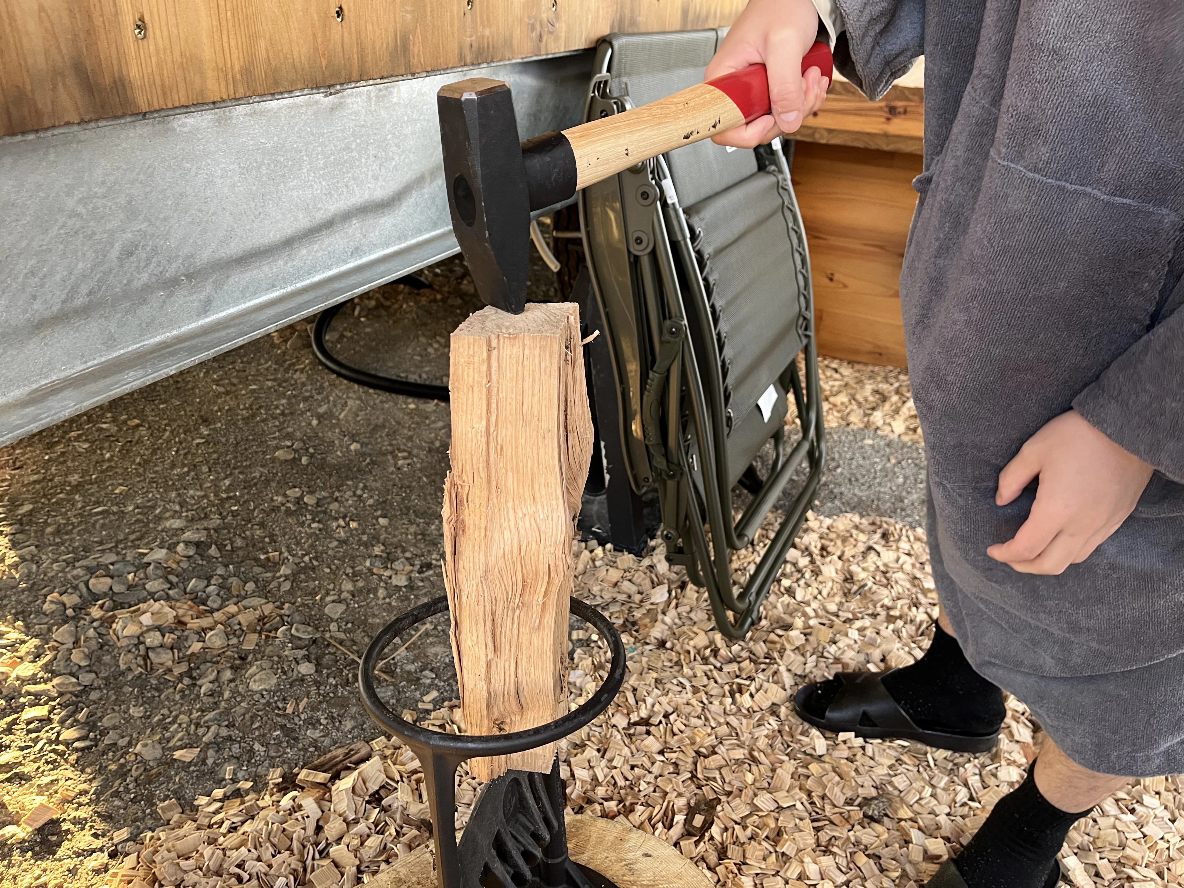 「最悪、サウナが温まらなくてもお湯を溜めてお風呂として楽しめばいいか」そんな保険をかけつつも、ここまで来たからにはサウナを堪能したい! 気を取り直して、まずは薪割りにチャレンジです。