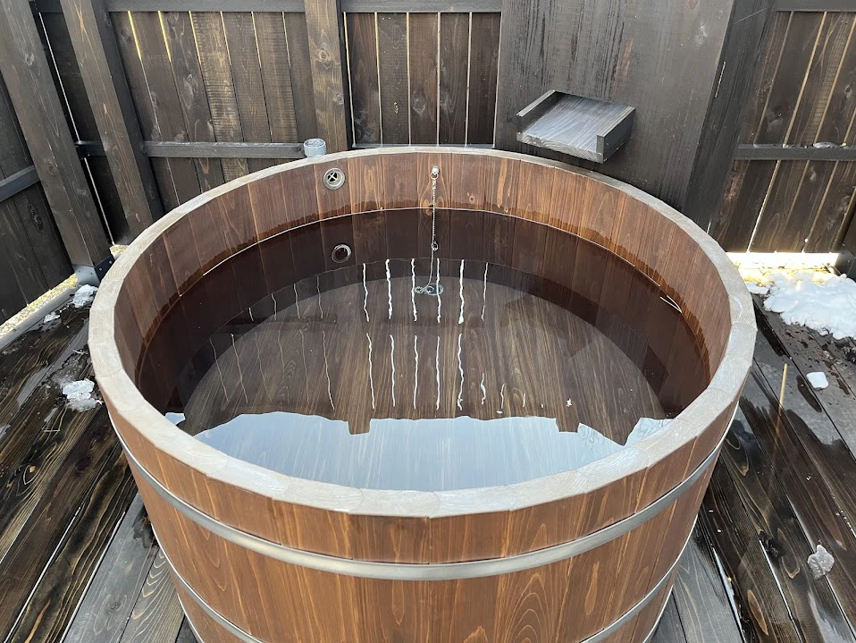 今回泊まったトレーラーハウスには、桶水風呂がついていました(部屋にはシャワーあり)。