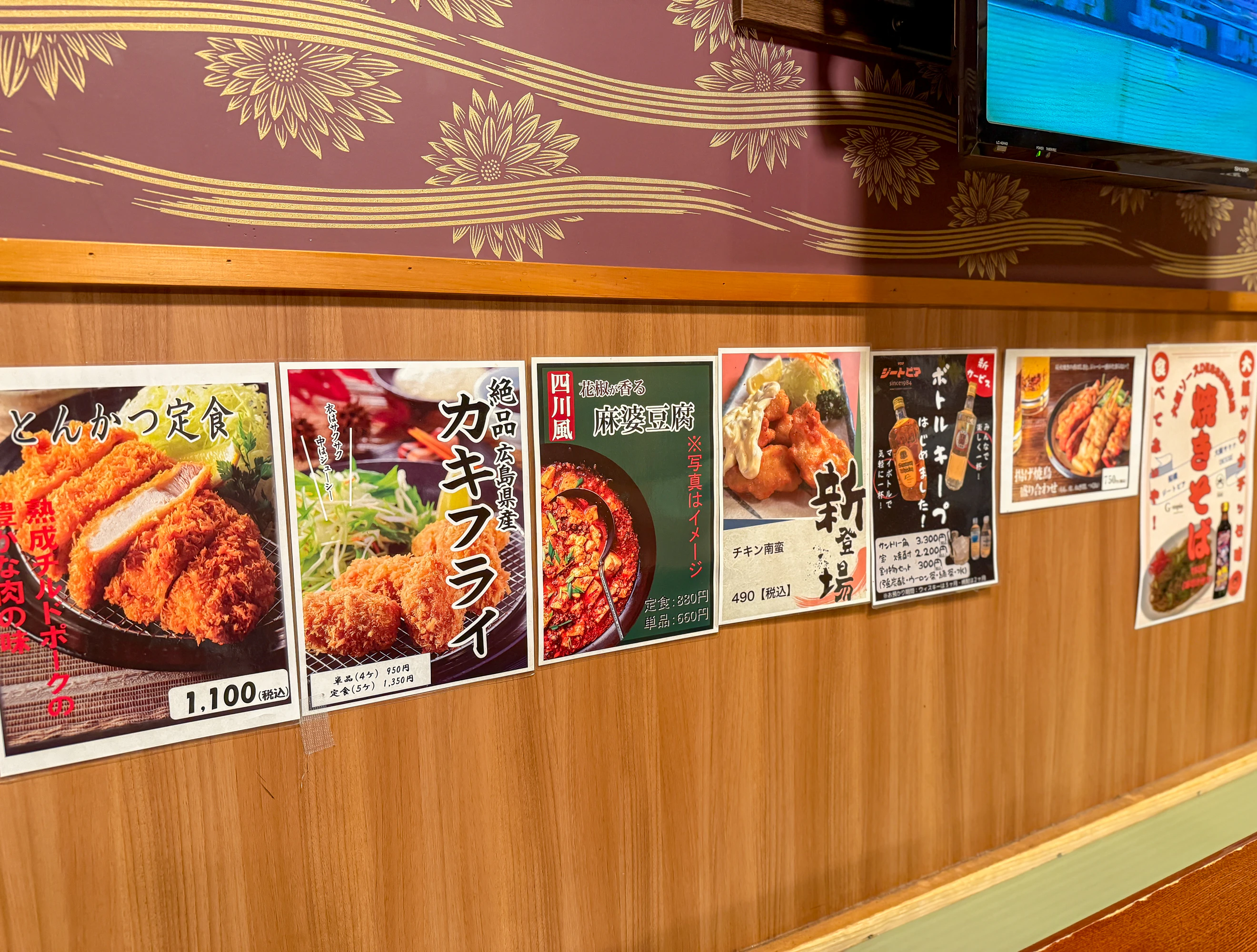 アルコール類はもちろんのこと、おつまみ系(焼き鳥、チキン南蛮などなど)、がっつり食べたい人向けの定食メニューもそろっています。