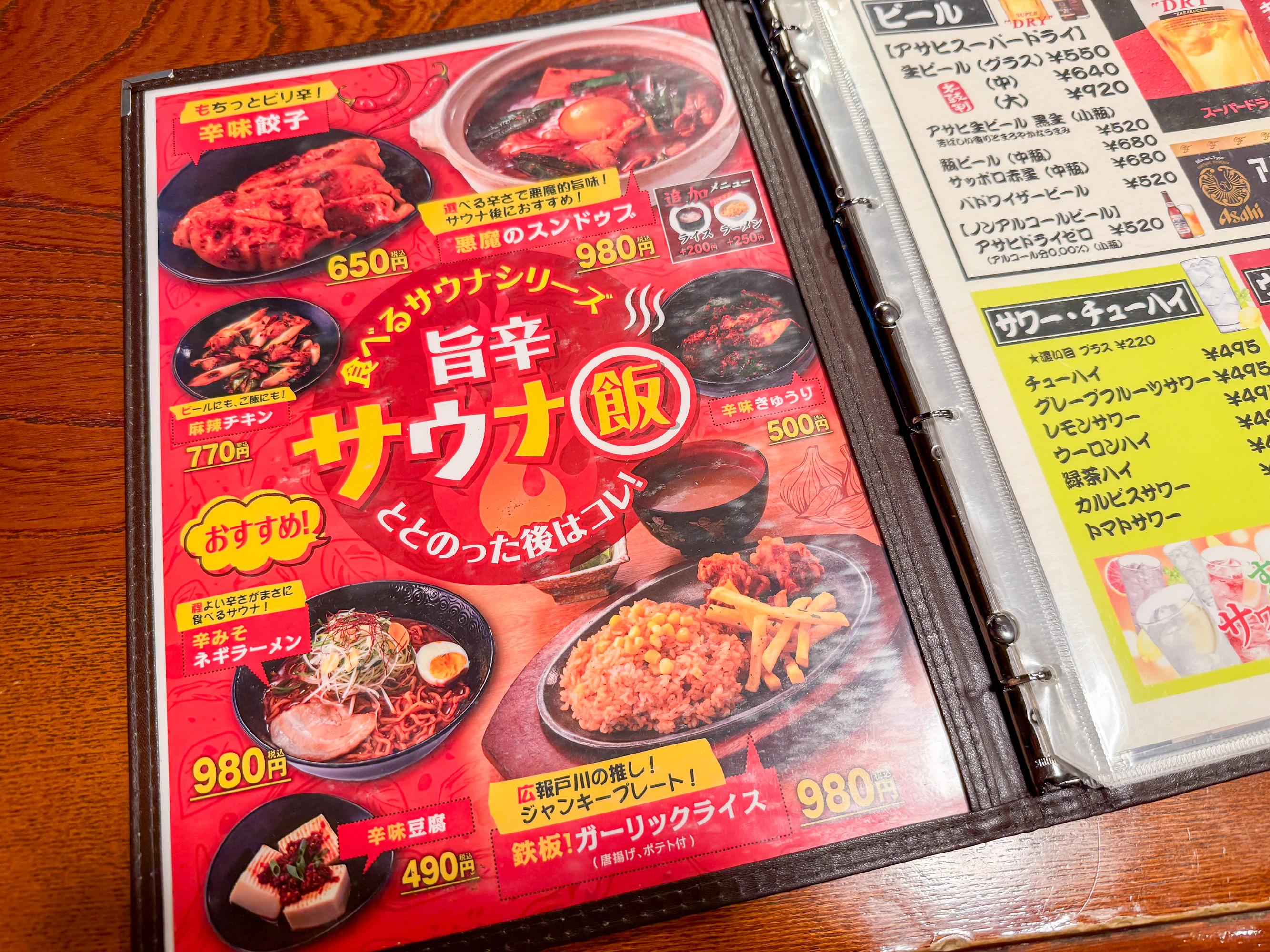 スンドゥブ以外の旨辛メニューが勢ぞろいした「食べるサウナシリーズ」メニューも充実しています。次回は辛みそラーメンかな……。