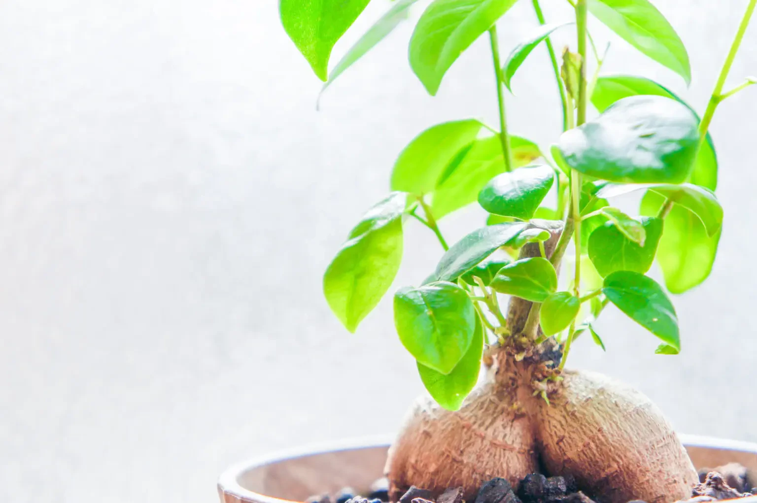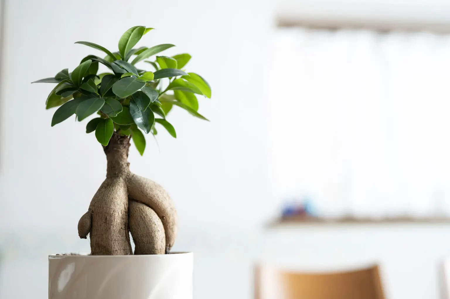 根本がぷっくりと膨らんだニンジンガジュマル。ホームセンターや園芸店でも販売されていることが多いため購入しやすいです。幹がニンジンのような見た目をしているのが特徴で、1つ1つ異なる樹形が楽しめます。テーブルや棚などの小スペースにも置きやすいため、気軽にチル空間が作れます。