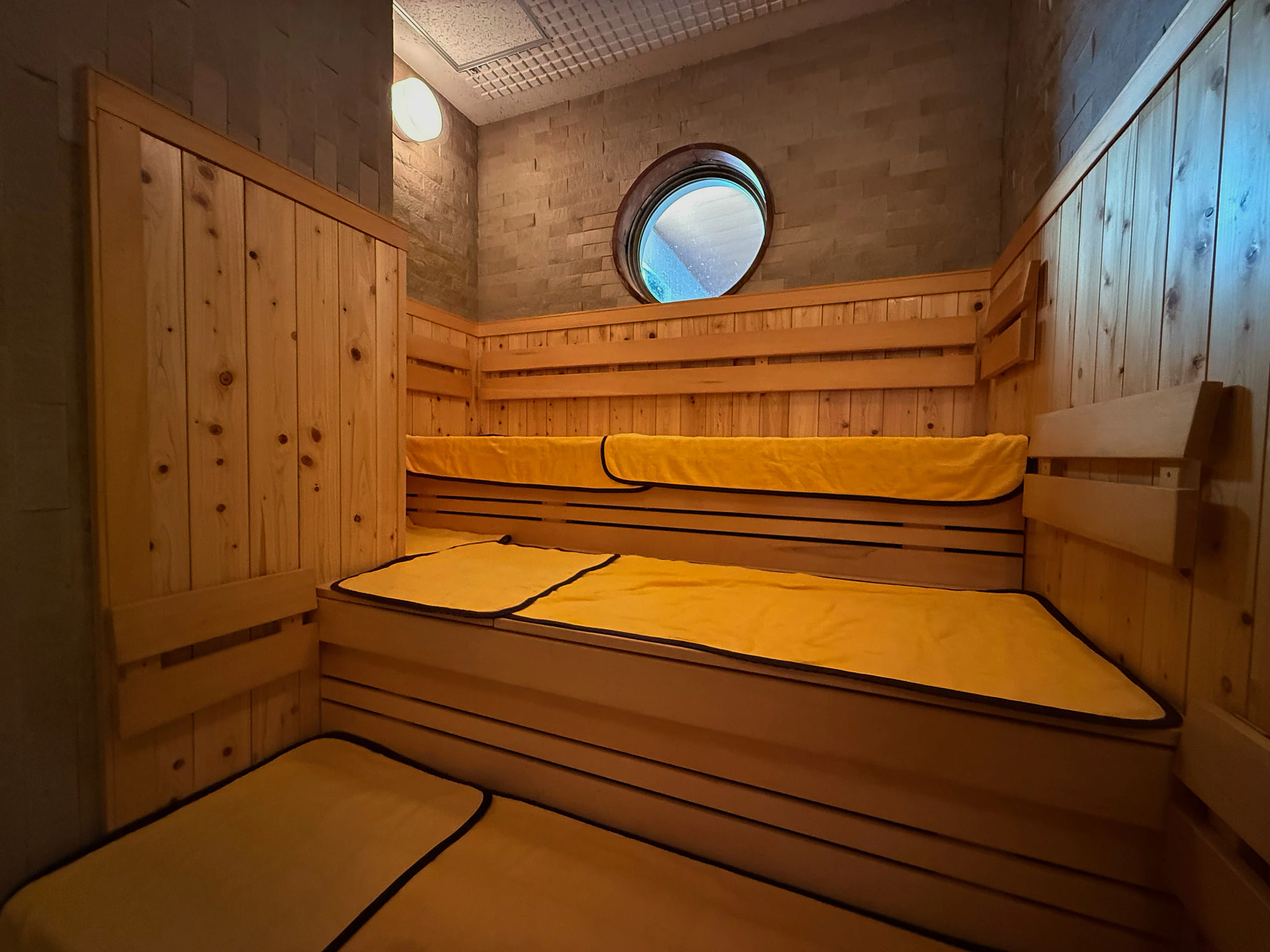 サウナ室は、タワー型の3段タイプ。高さだけでなく、奥行きにも広さがあります。清潔感もたっぷりで過ごしやすいです。温度は90度ちょっと。じんわり身体を温めるのにぴったりなコンディションでした。