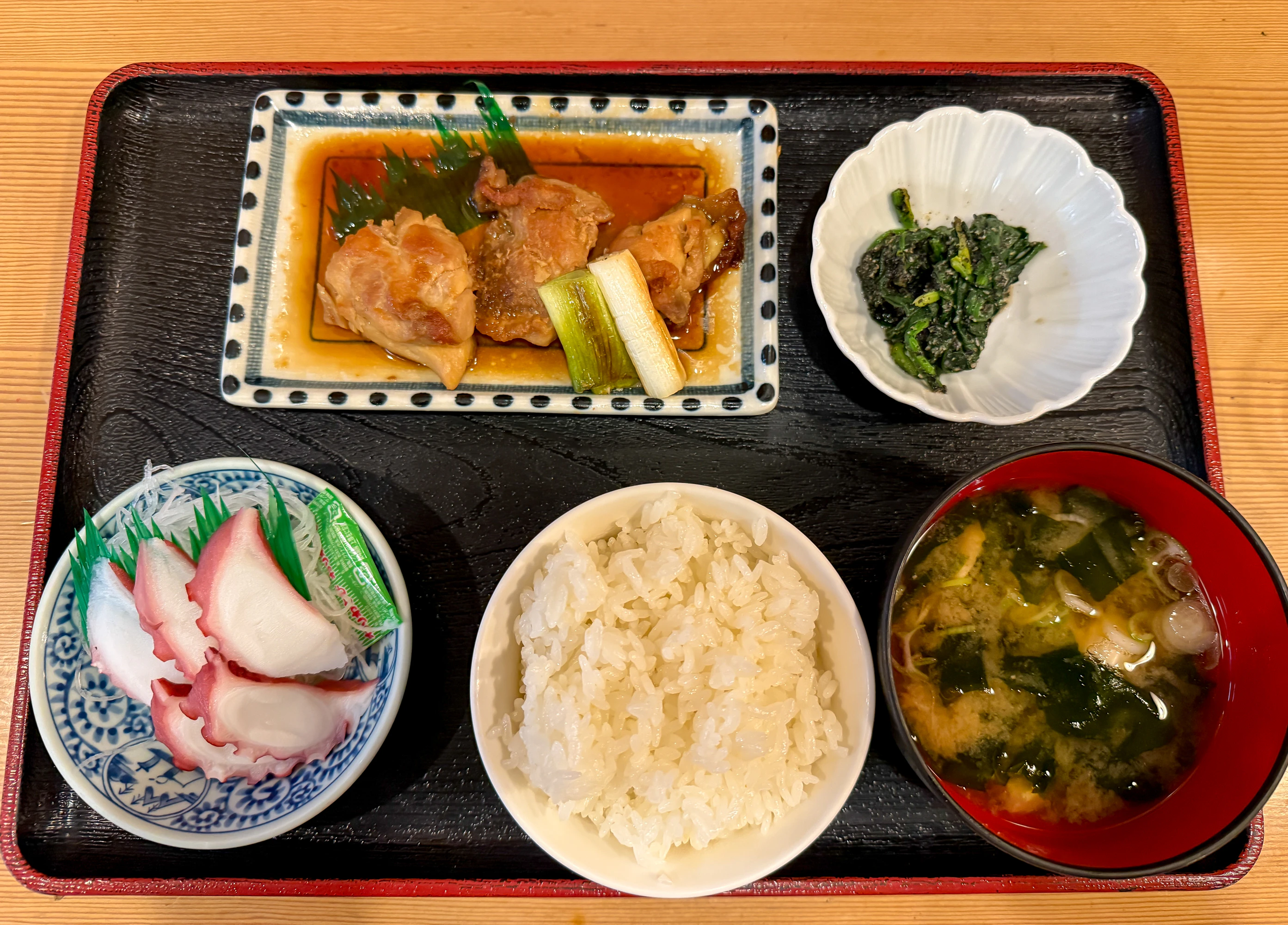 実際に選んだのがこちらのメニュー!あまみのあるタレに絡んだやきとりに、タコの刺身、ほうれん草のごま和え、ご飯とみそ汁までついて、これでなんと1,000円ちょっと。コスパ良すぎますよね…!