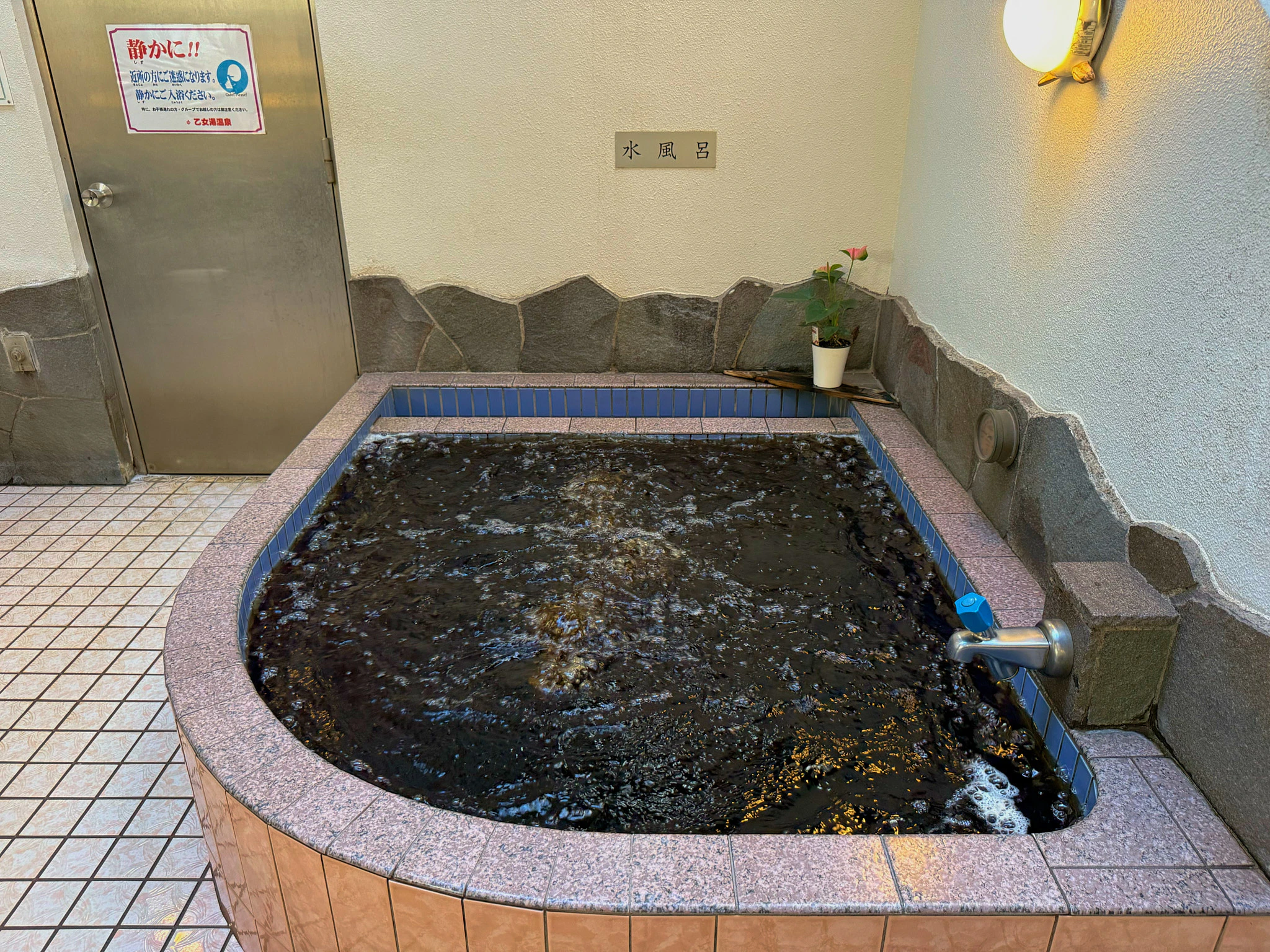 注目の黒湯水風呂は、スルッと肌に馴染む質感。浸かった瞬間から「これは…」とわくわくさせられる心地よさです!浴槽は深めのつくりで、首元まで楽な姿勢でスッと入水できました。