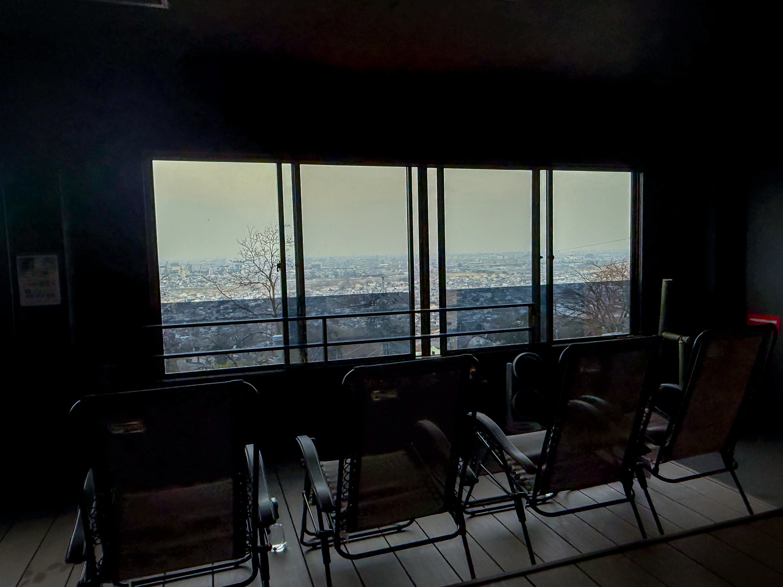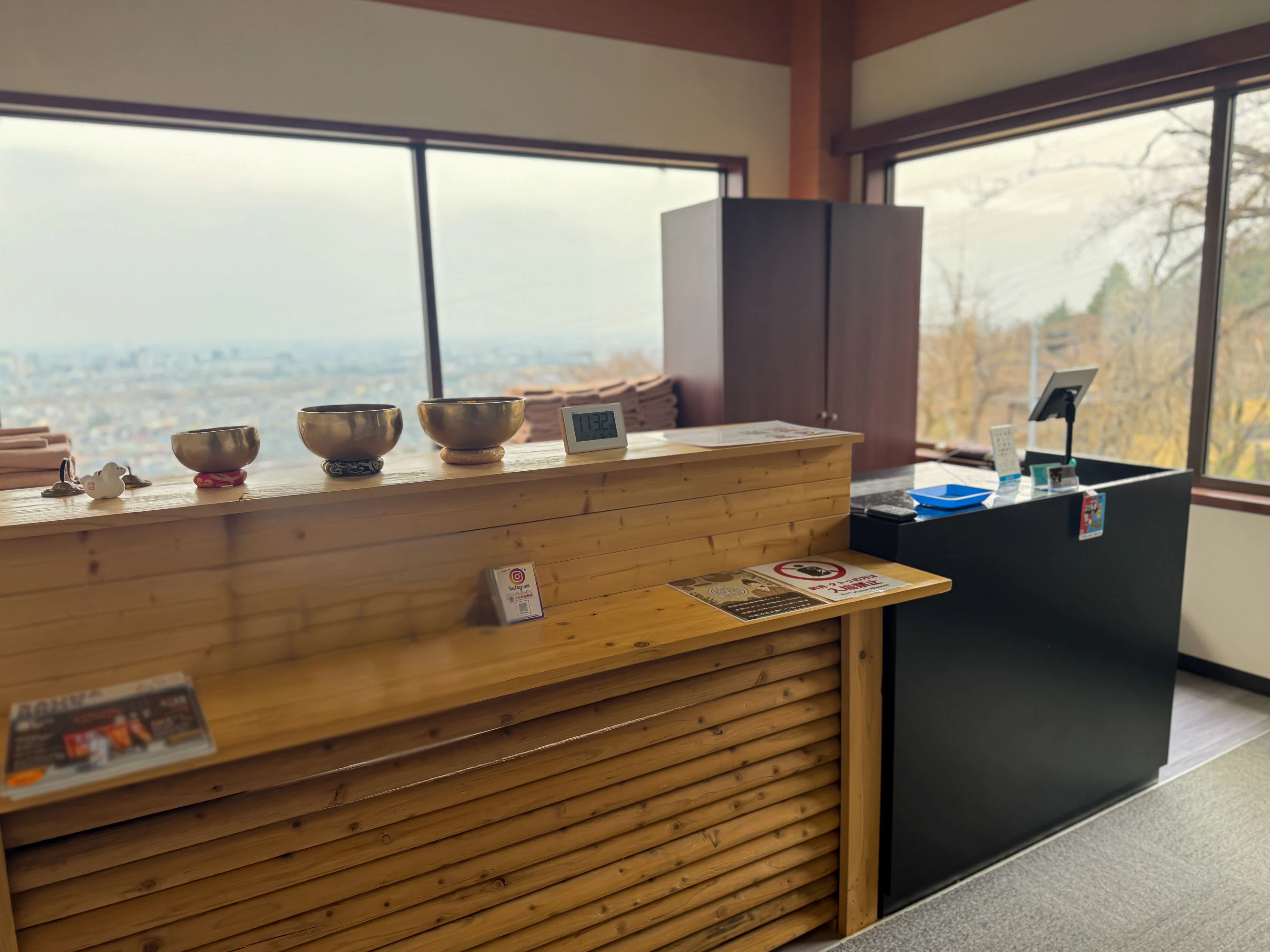 「釈迦炎舞」の収容人数は23名ほど。座面も奥行きがあって座りやすく、どしっと腰をかけてストレスなく座れます。窓の外には、高崎の街並みが広がるのも魅力。開放感にあふれた空間です。