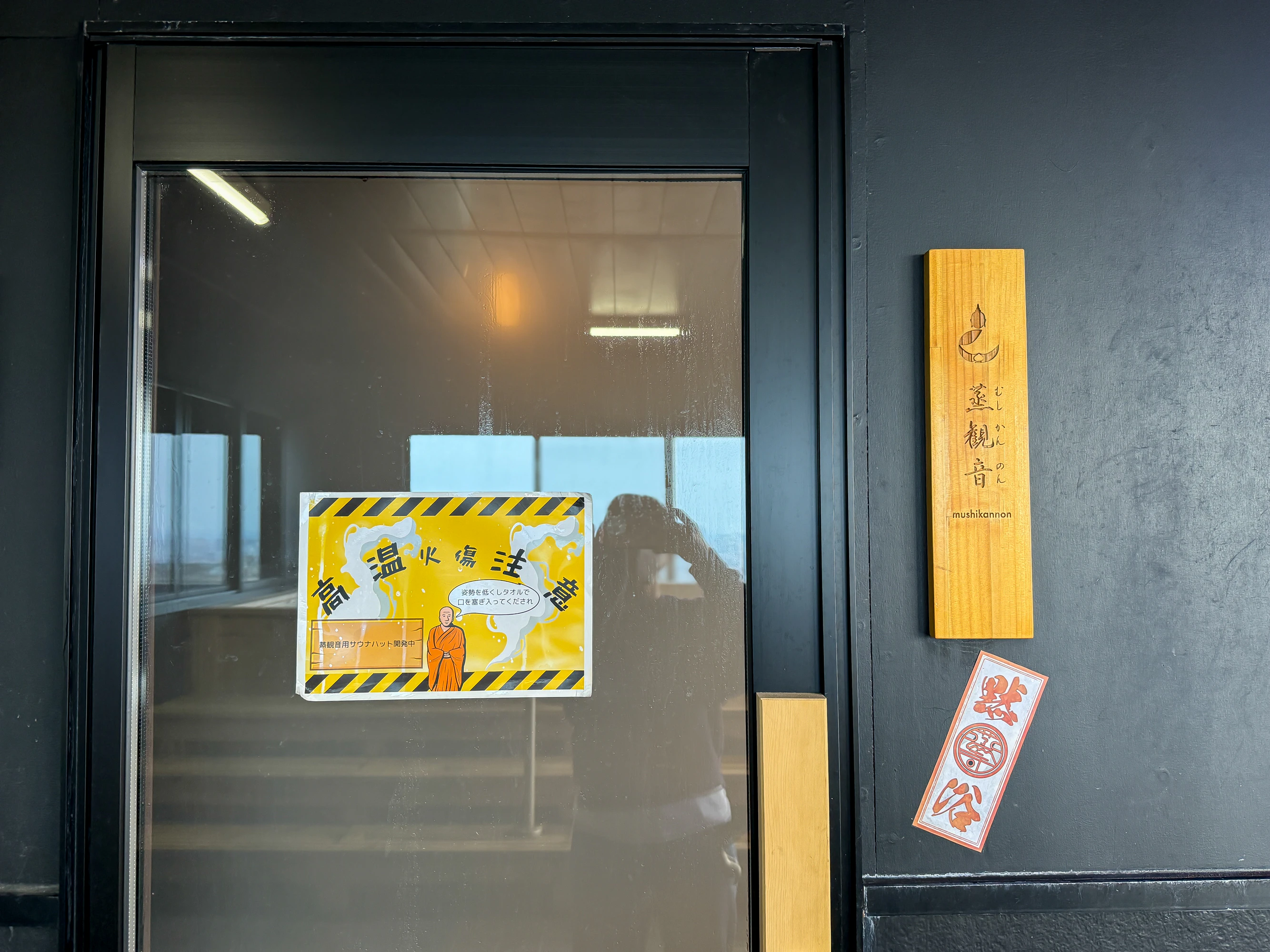 さてさて、「観音山サウナ」のサウナ室、一体どのくらい熱いのか確かめにいきましょう。まずやってきたのが、メインサウナの「釈迦炎舞」。