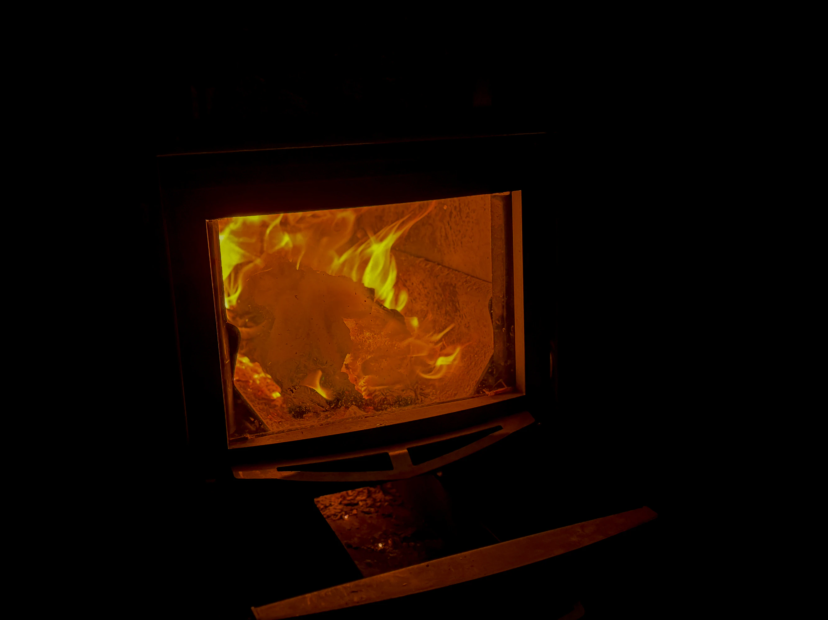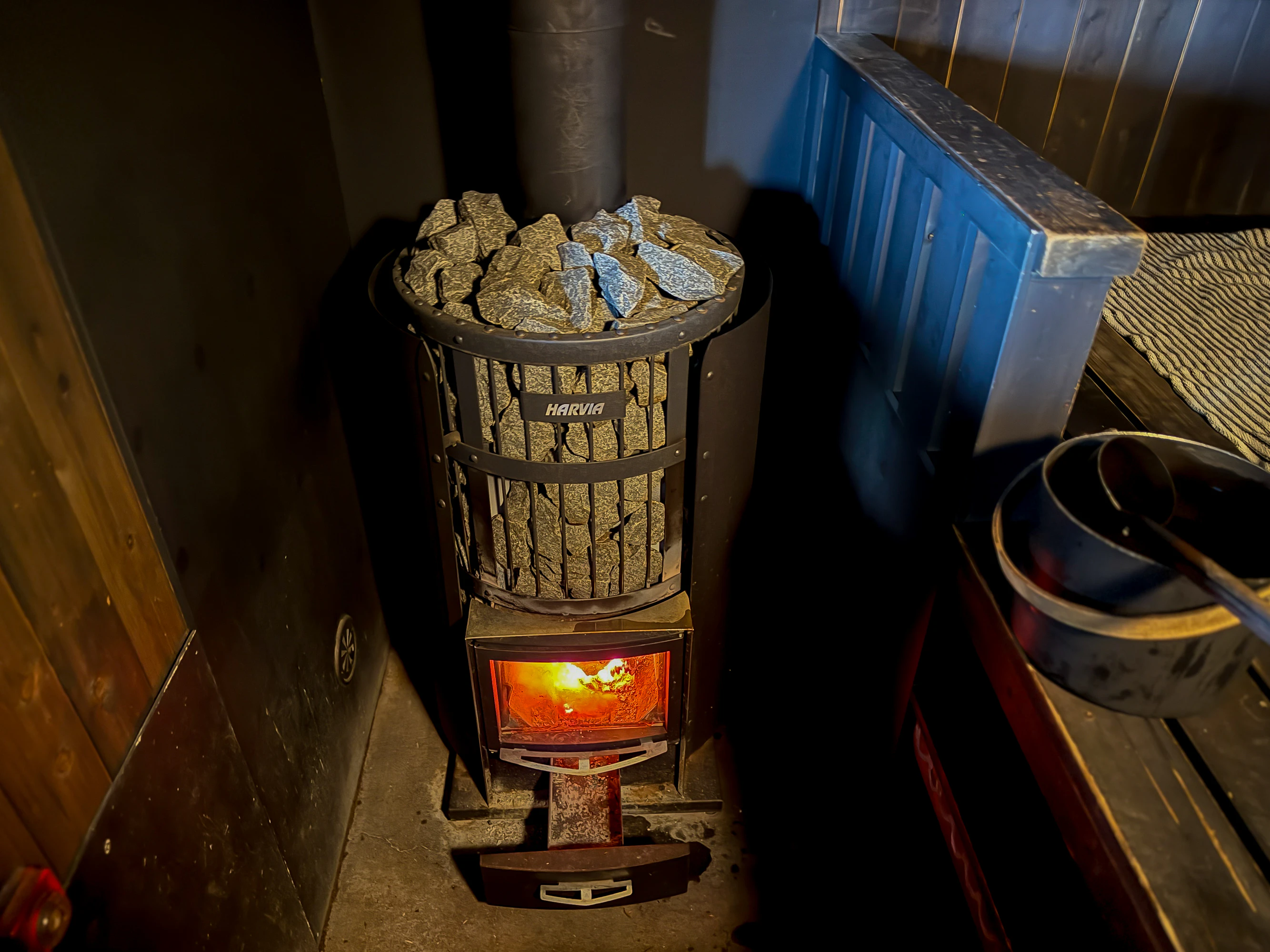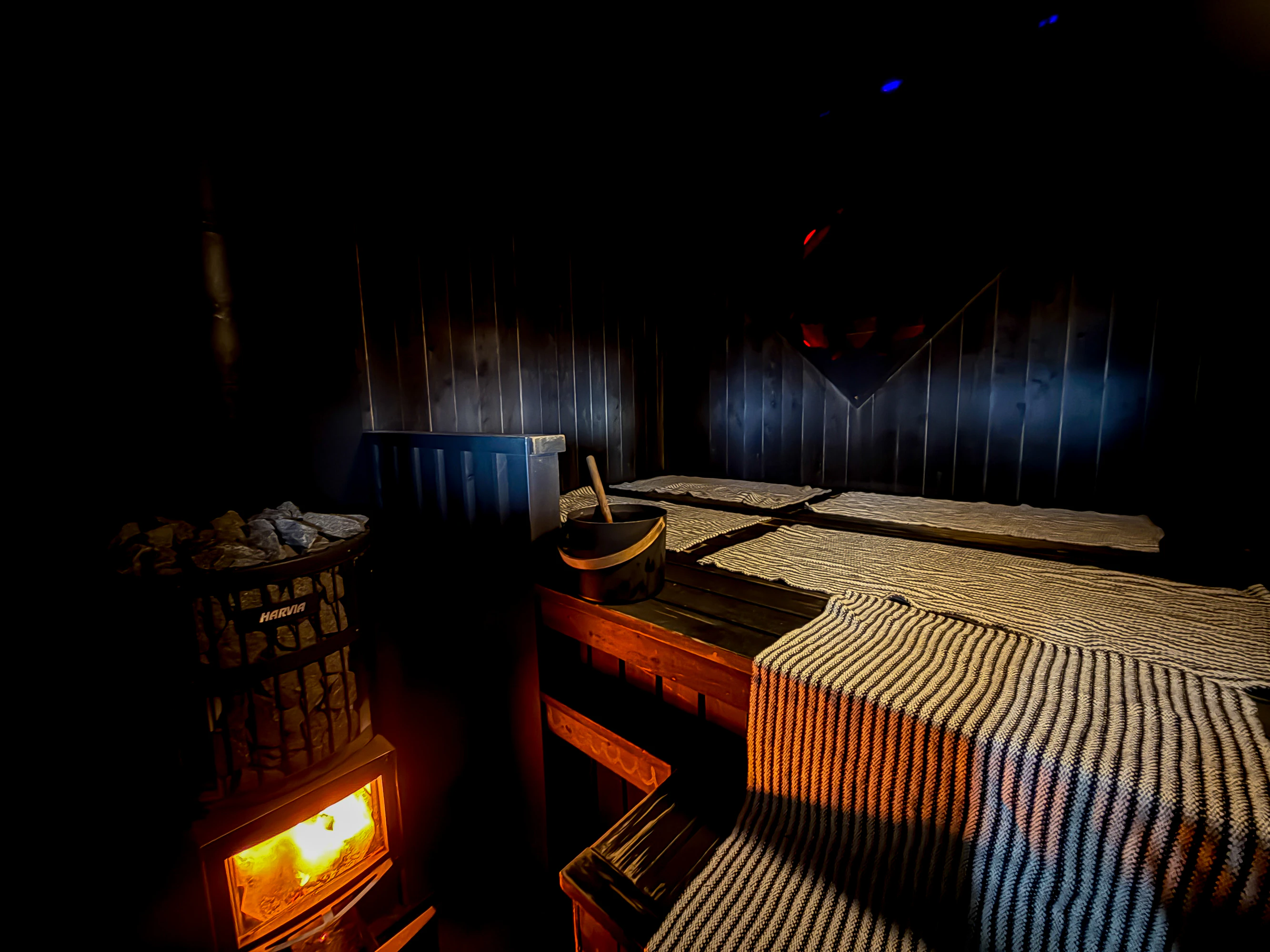 ストーブには、眺めるもよし、音に耳を傾けるもよしな、薪サウナを贅沢に使用。胸の高さほどあるストーブに合わせるように作られた座面は、大人4人がゆったりと座れるくらいの広さ。