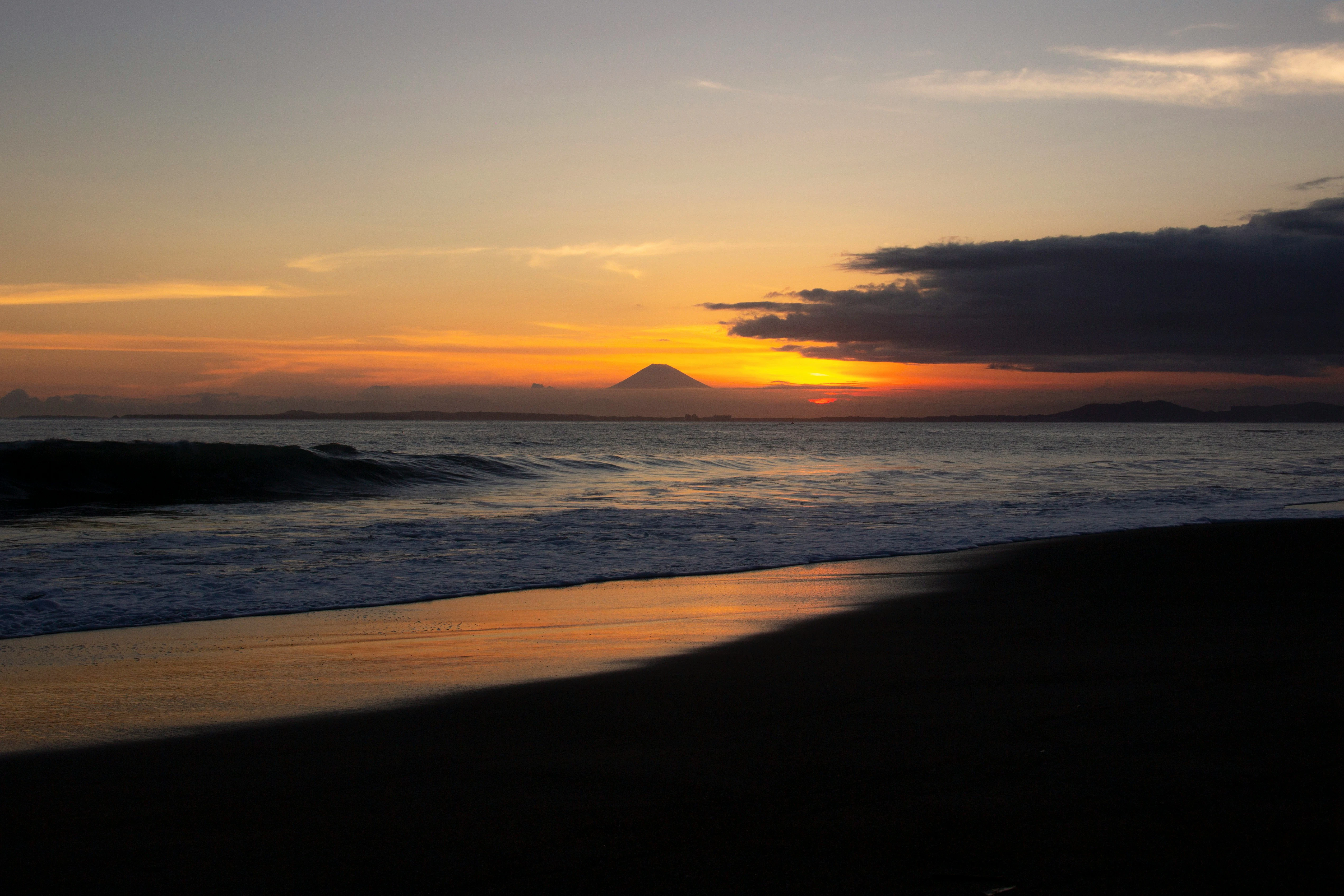 サーフィン発祥の地としても知られている神奈川県藤沢市の鵠沼海岸では、海と夕日のコラボレーションを堪能できます。海岸からは江の島や富士山も見えるため、夕日が沈む姿はまさに絶景。浜辺全体が夕日のオレンジ色に染まっていく幻想的な風景を楽しめます。遠浅で砂浜が広いため、波がひいて濡れた浜辺に夕日が反射する美しい風景も見られるでしょう。