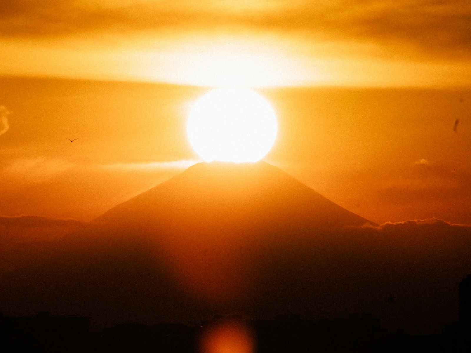 最後に紹介するのは「ダイヤモンド富士」です。これは太陽が昇る瞬間と夕日が沈む瞬間、山頂に太陽が重なりダイヤモンドが輝いているように見える現象のこと。ダイヤモンド富士を見るには、富士山の見える方角が東か西であることと、気象条件の良さが揃わないといけません。見られるタイミングや場所が限られているので、ダイヤモンド富士を見られたら特別なチルタイムになりそうです。