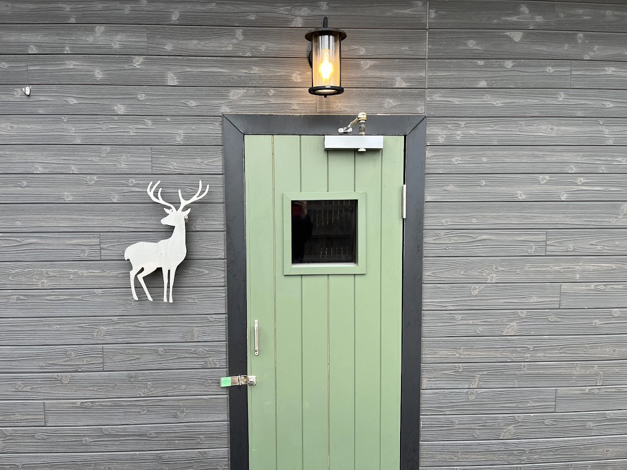 水着に着替えてポンチョを羽織り、外のサウナゾーンへ。サウナ室の扉には鹿のマークが貼ってあり、「噂に聞いていたサウナに来たぞ!」という気持ちが高まります。