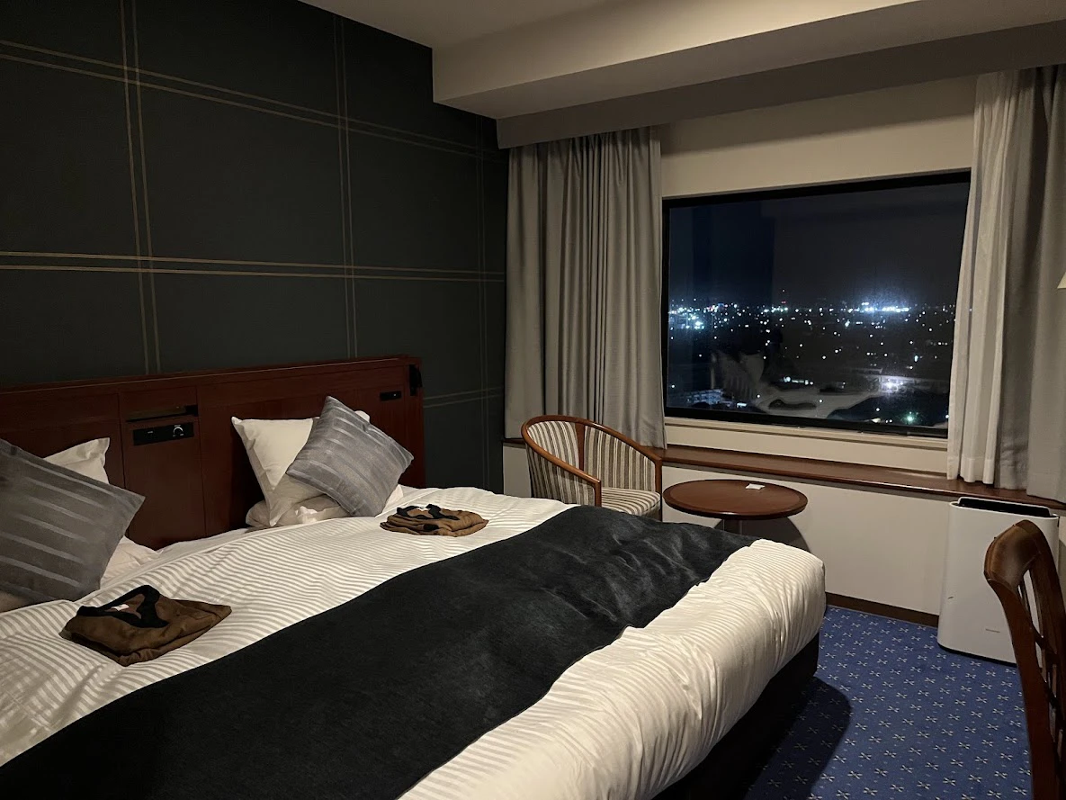 今回はダブルベッドの客室に宿泊。大きな窓からは、鹿嶋・神栖の市街地と工場夜景が広がっていてロマンチックでした。