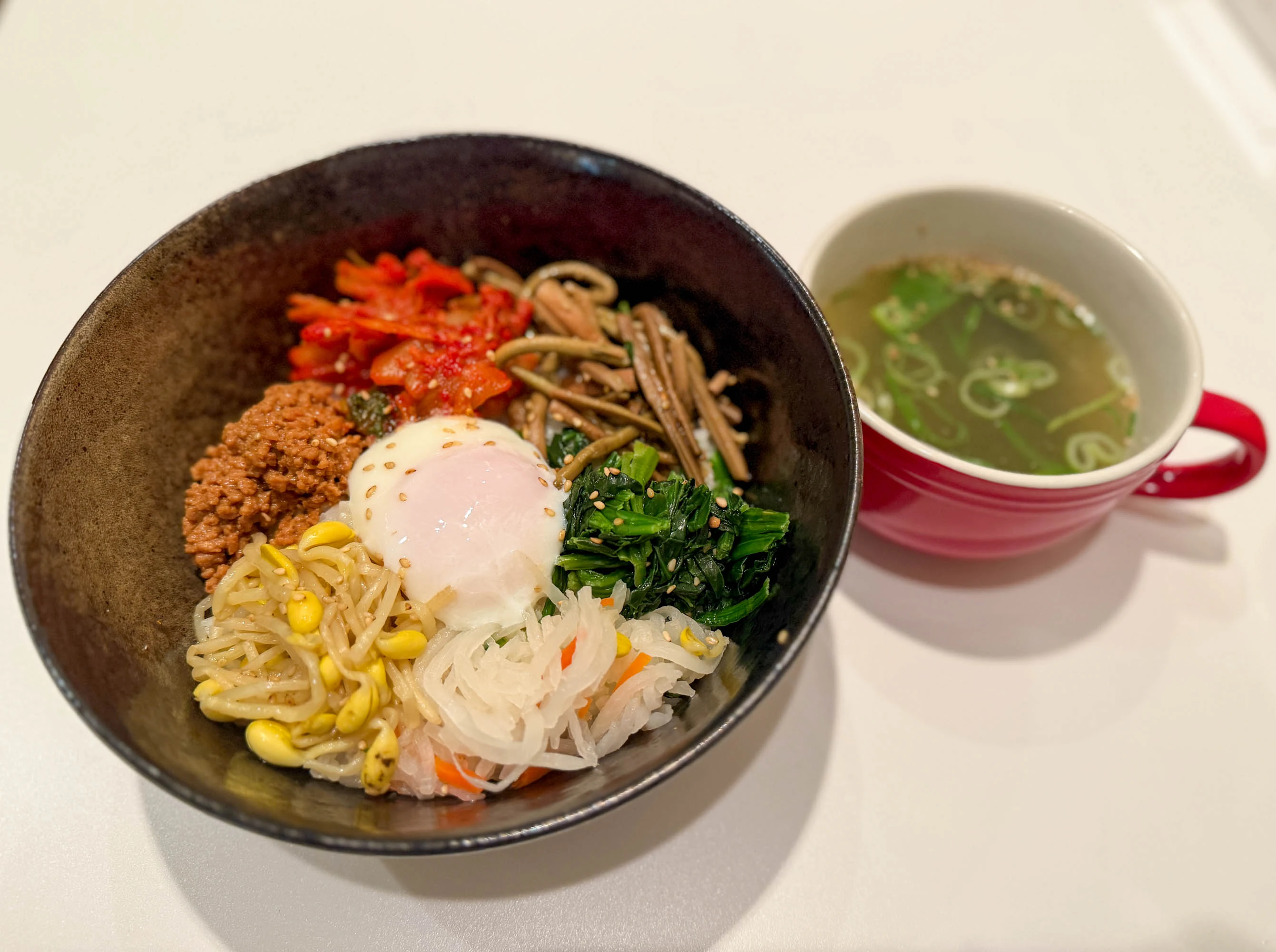 今回は「たくさん食べたいけど、カロリーも気になる」そんなわたしにぴったりな『6種の具材のヘルシービビンバ』を注文。お肉は控えめなのに具材がもりもりなので、満足感たっぷりでした。スープがついてくるのもうれしい!